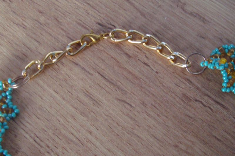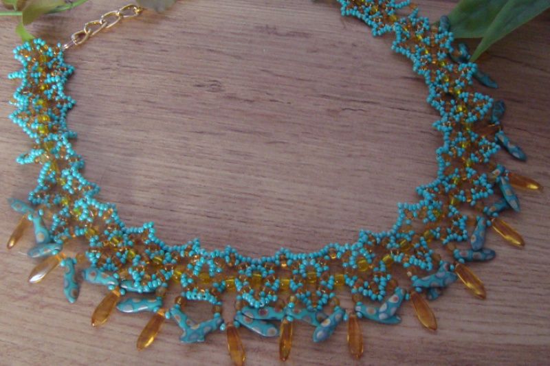 Ажурное колье из чешского бисера и бисера-твин, украшено красивыми чешскими бусинами-перышками, сзади на цепочке и застежке карабине.