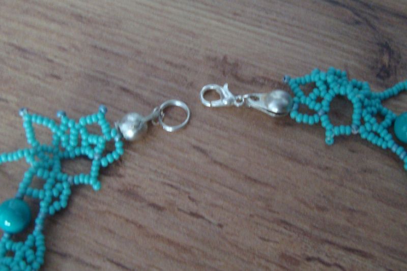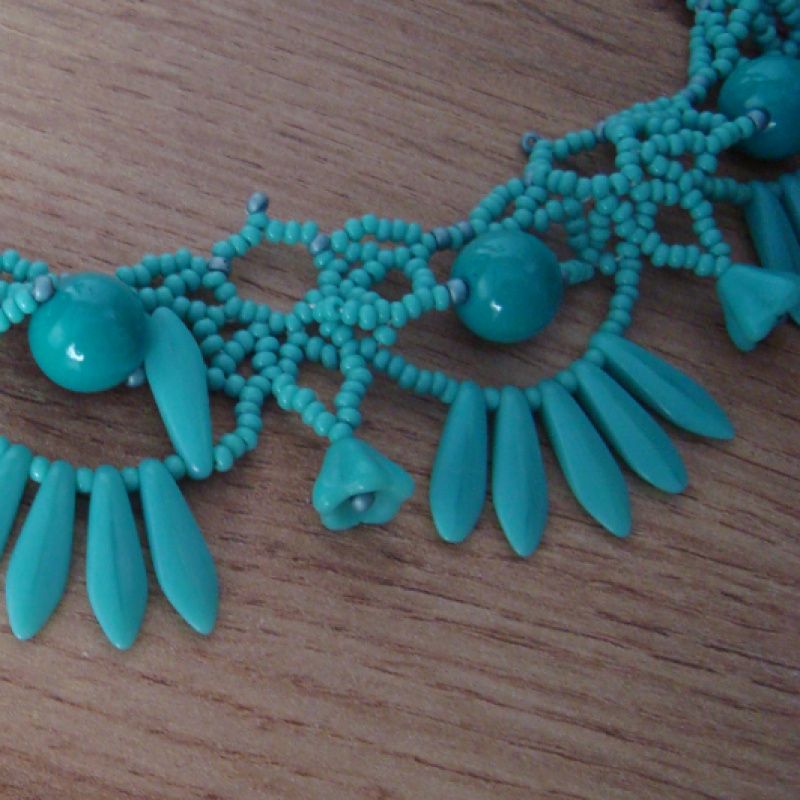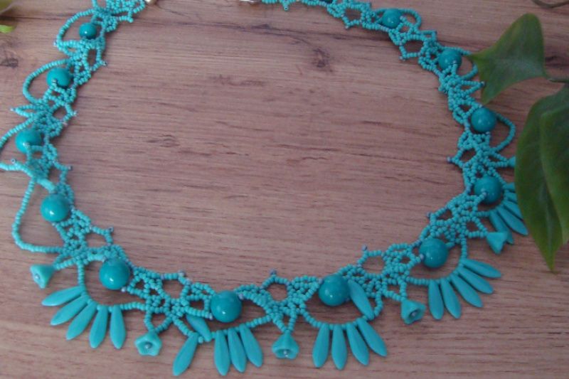 Элегантное ажурное колье с вплетенными чешскими бусинами, цветочками и бусинами-перышками цвета морской волны, изготовлено из чешского бисера ,замок - карабин
