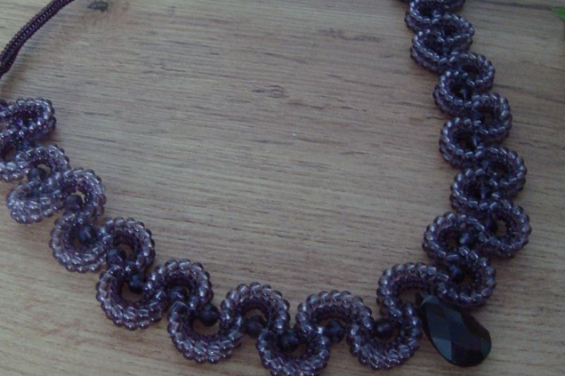 Колье выполнено из чешского бисера двух размеров и украшено по центру стеклянной каплевидной бусиной, застегивается на небольшой магнитный замок