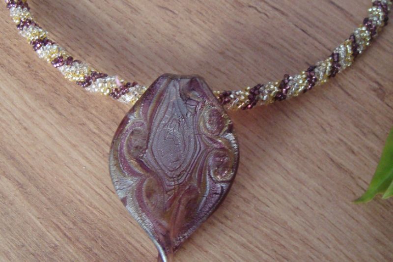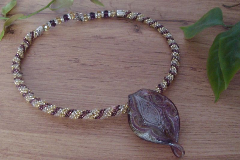 Колье-чокер на мемори проволоке, жгут из чешского бисера, кулон-подвеска из стекла 7 см, замок - карабин