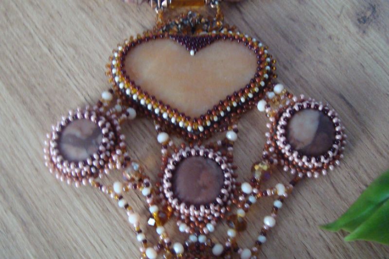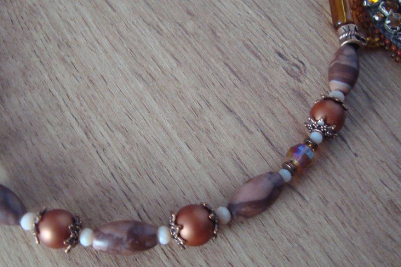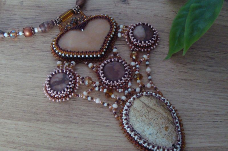 Колье-чокер собрано из натуральных камней на мемори проволоке. Кулон состоит из 5 элементов натуральных камней яшмы ажурно соединенных между собой чешским бисером, ронделями и граненными хрустальными бусинами. Колье выполнено в теплых коричнево-бежевых оттенках на замке-крючке в тон.