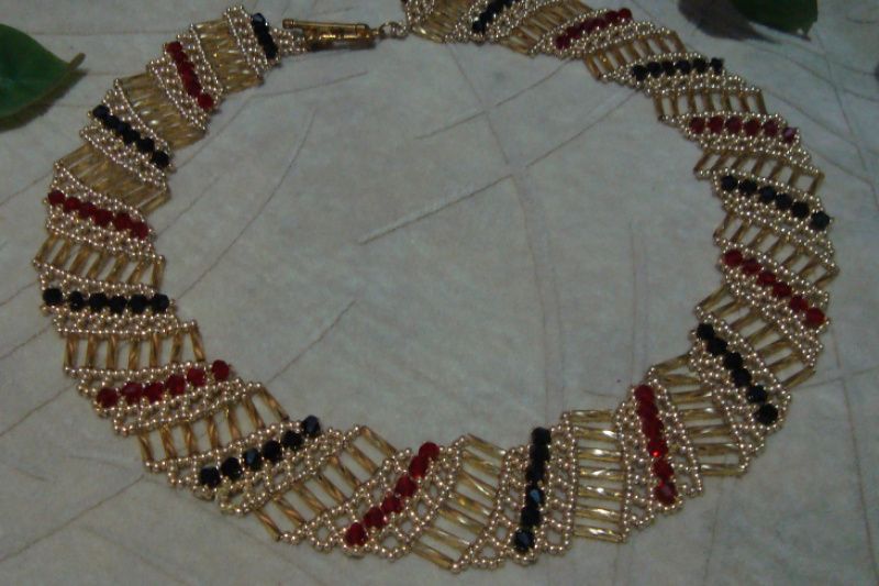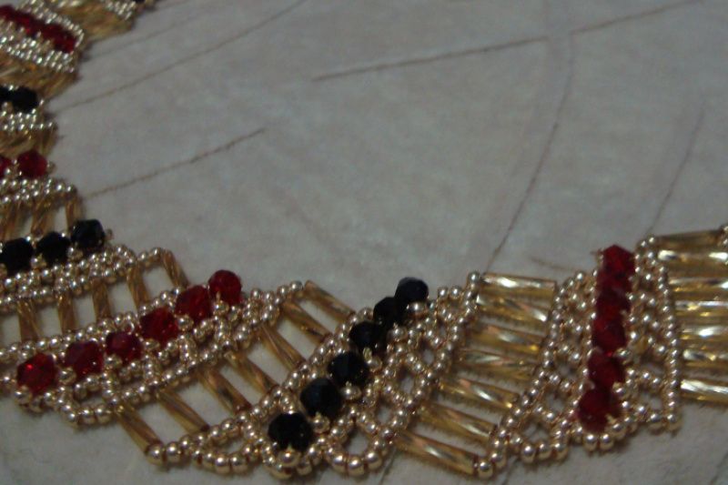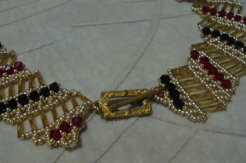 Бисерное колье - оплечье выполнено из чешского металлизированного стекляруса и бисера, расшито стеклянными биконусами красного и черного цвета, застежка - тогл.