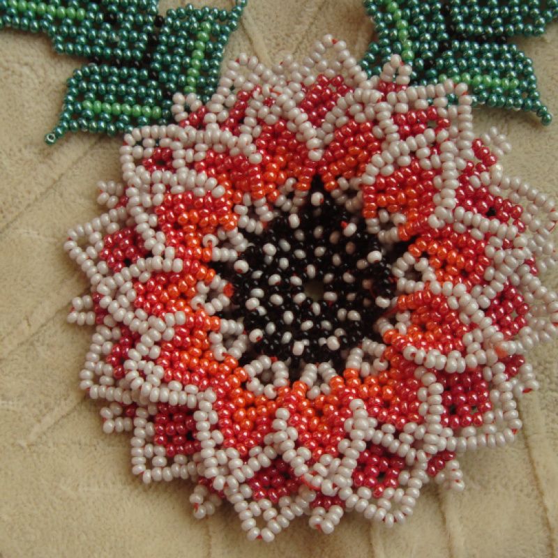Украшение в стиле уичольских мотивов выполнено из чешского бисера. Длина изделия от замка до низа цветка 37 см, застегивается на замок-крючок серебряного цвета длиной 3 см