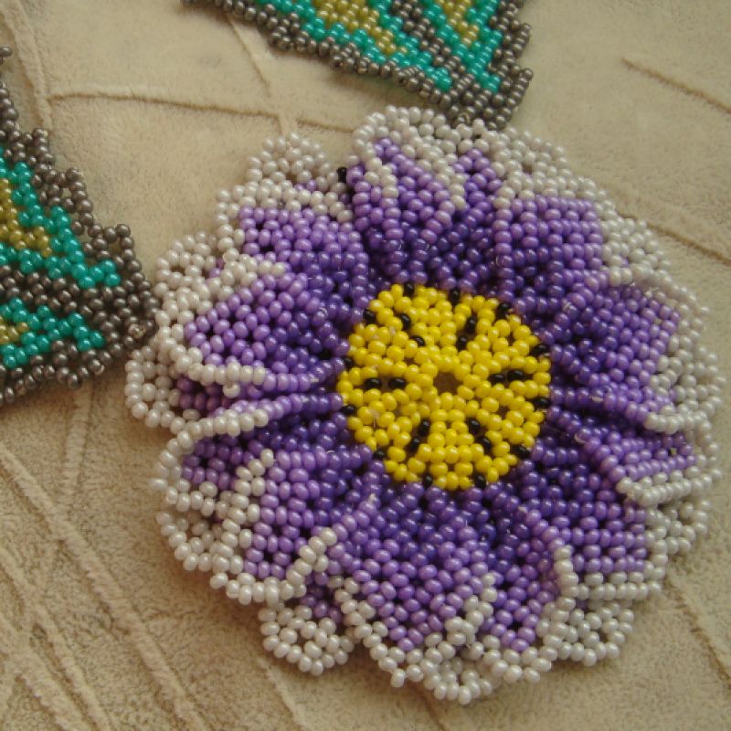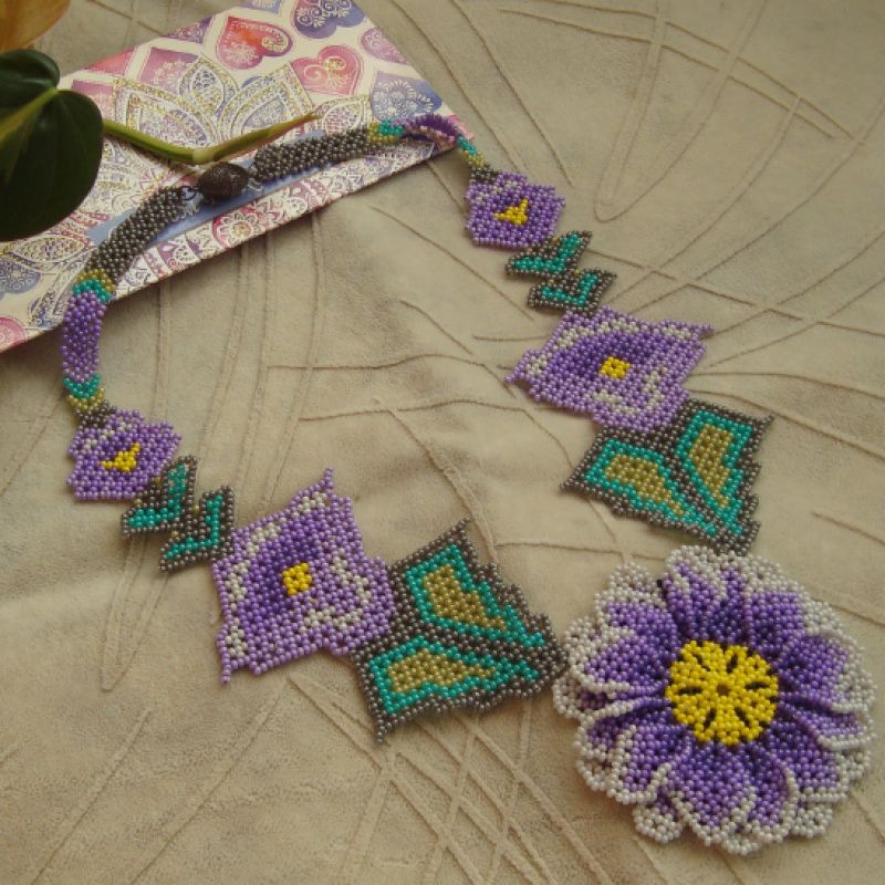 Колье выполнено в стиле уичольских мотивов из чешского бисера. Замок магнитный. Длина от застежки до низа цветка 30 см., диаметр цветка 8 см