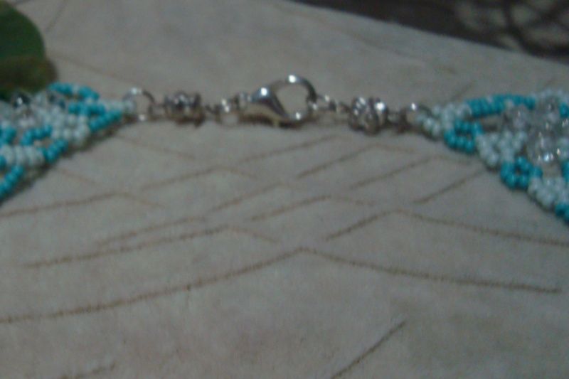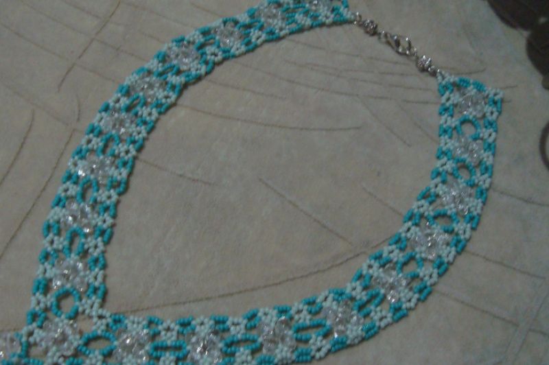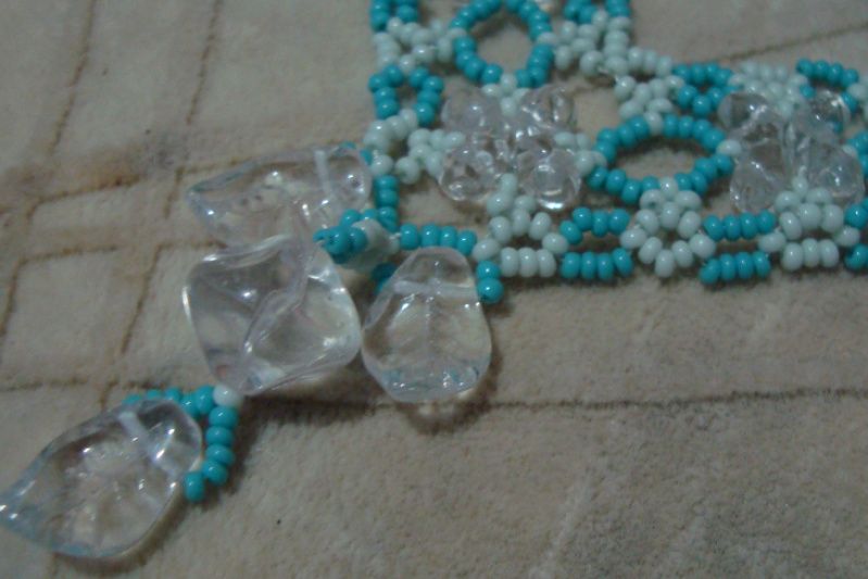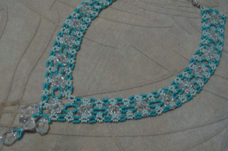 Колье V-образного силуэта из чешского бисера в двух оттенках мятного и зеленого цвета, расшито прозрачными ронделями и украшено прозрачной бусиной с листочками, замок карабин