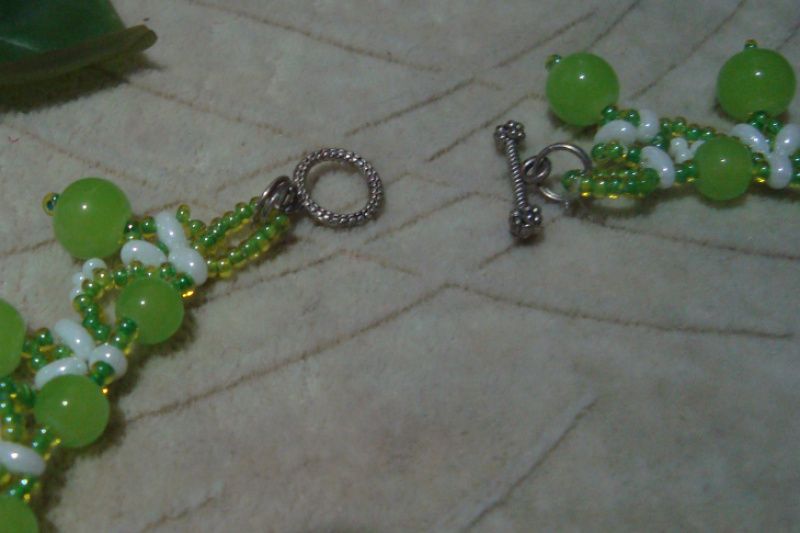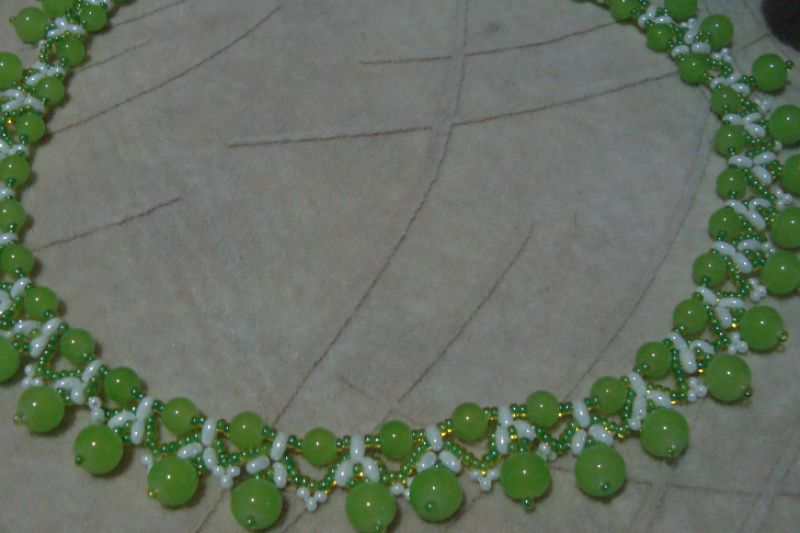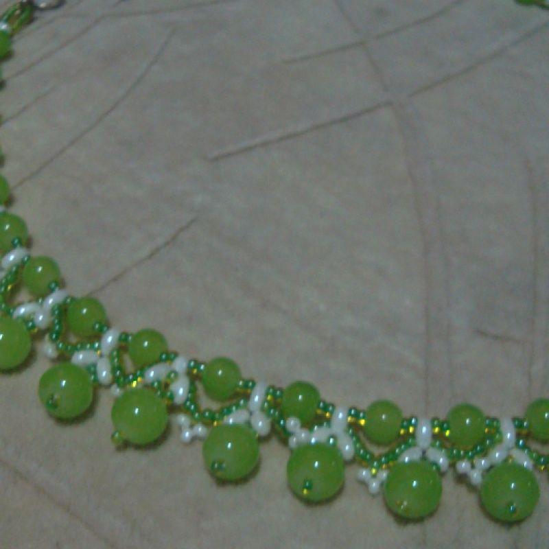 Колье выполнено в сочно-зеленом цвете бусинок двух размеров с использованием чешского бисера и бисера-твин, замок - тогл.