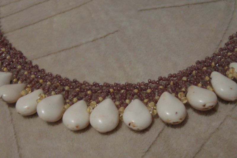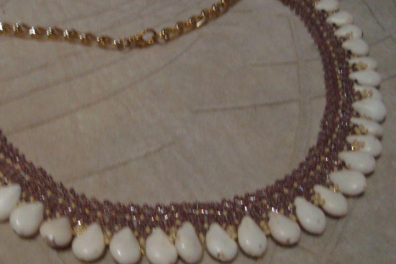 Ажурное колье из чешского бисера в бежевых оттенках с использованием бусин-капель натурального говлита на цепочке с застежкой-карабином