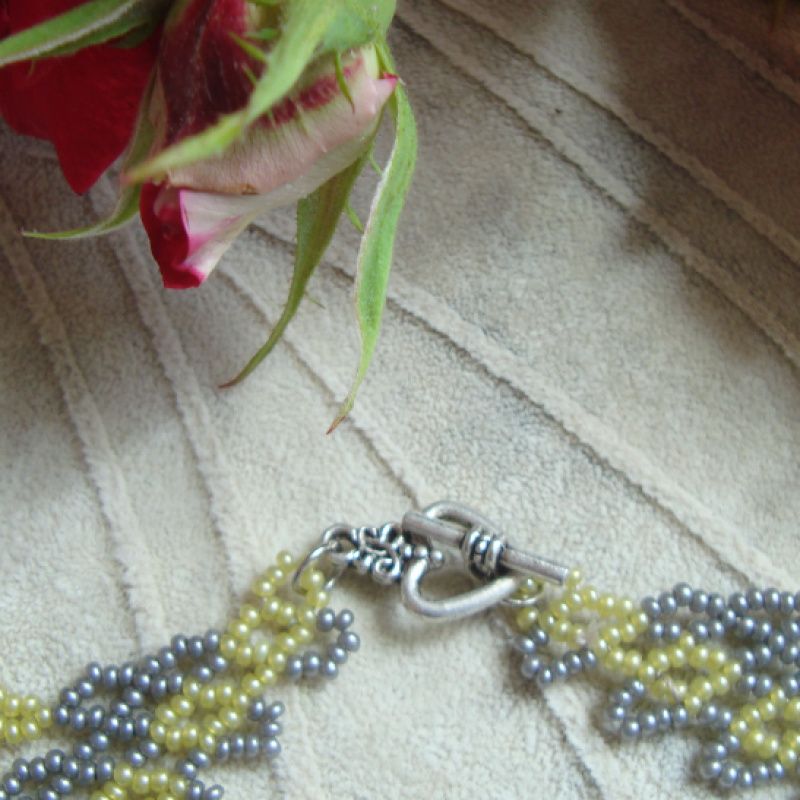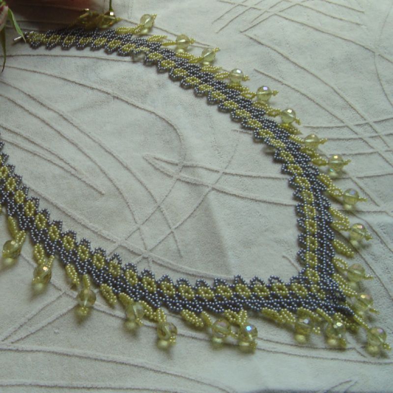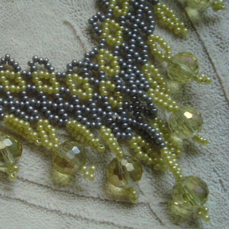 Колье V-образного силуэта,в серо-желтых тонах из чешского бисера, украшен красивыми гранеными бусинами желтого цвета с АB-покрытием. Длина всего колье 58 см + замок-тогл 2 см