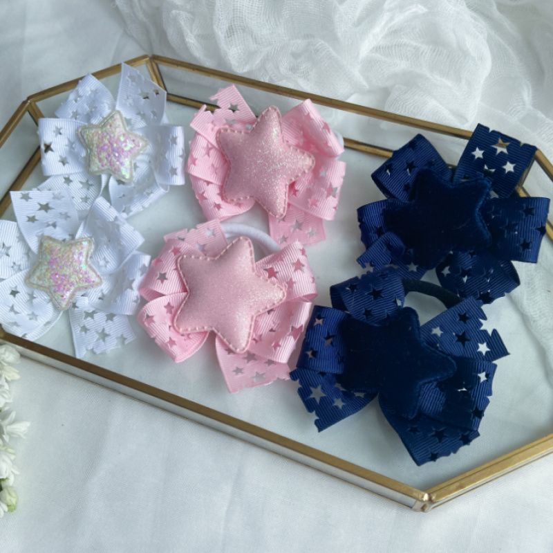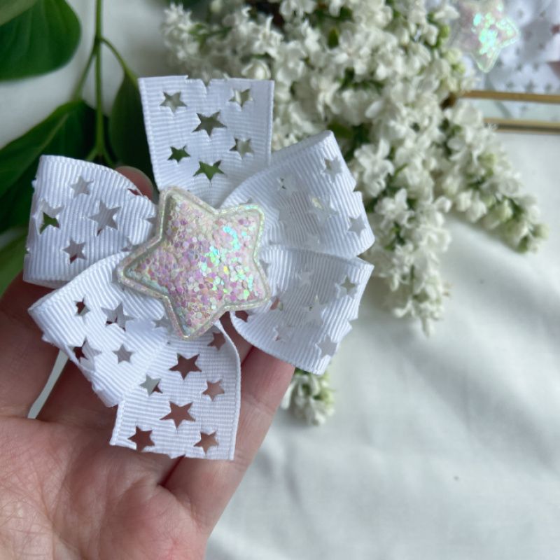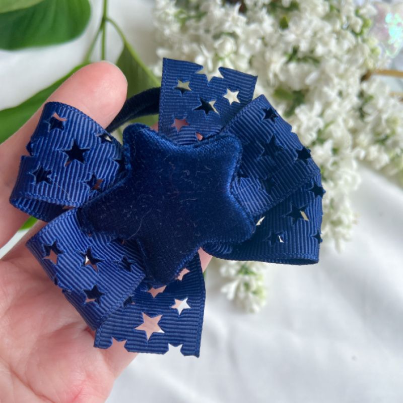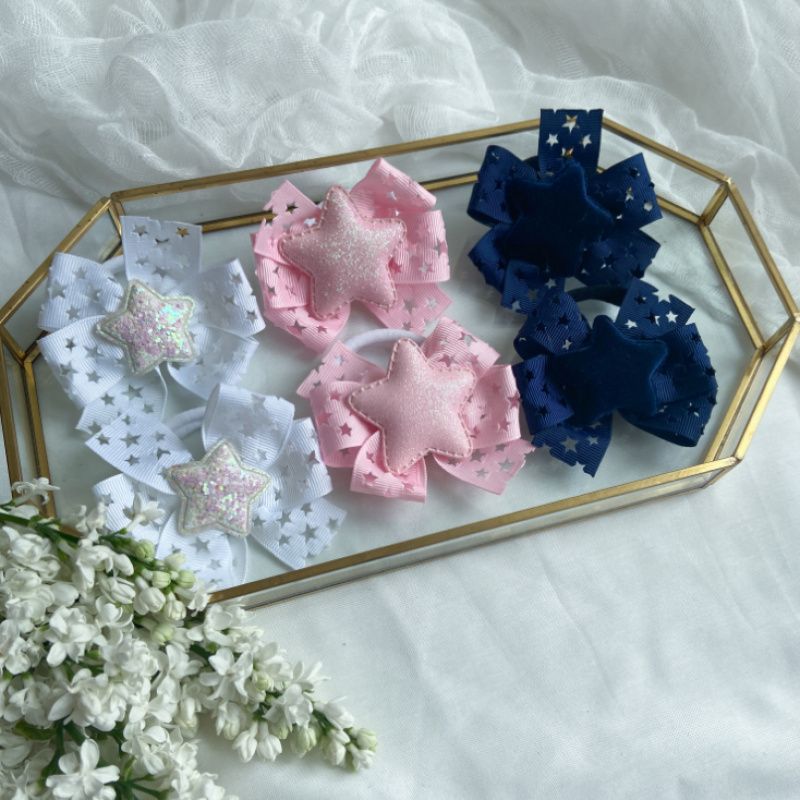 Классические бантики сделаны из верь ленты двохстороньои с вырезными звездами. Сделаны из одного слоя стрички.Прикрашени звездами. Крепеж-резинки бесшовные. Цена указана за набор. Размер бантика 7см.