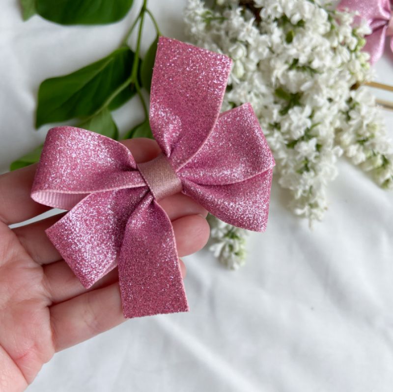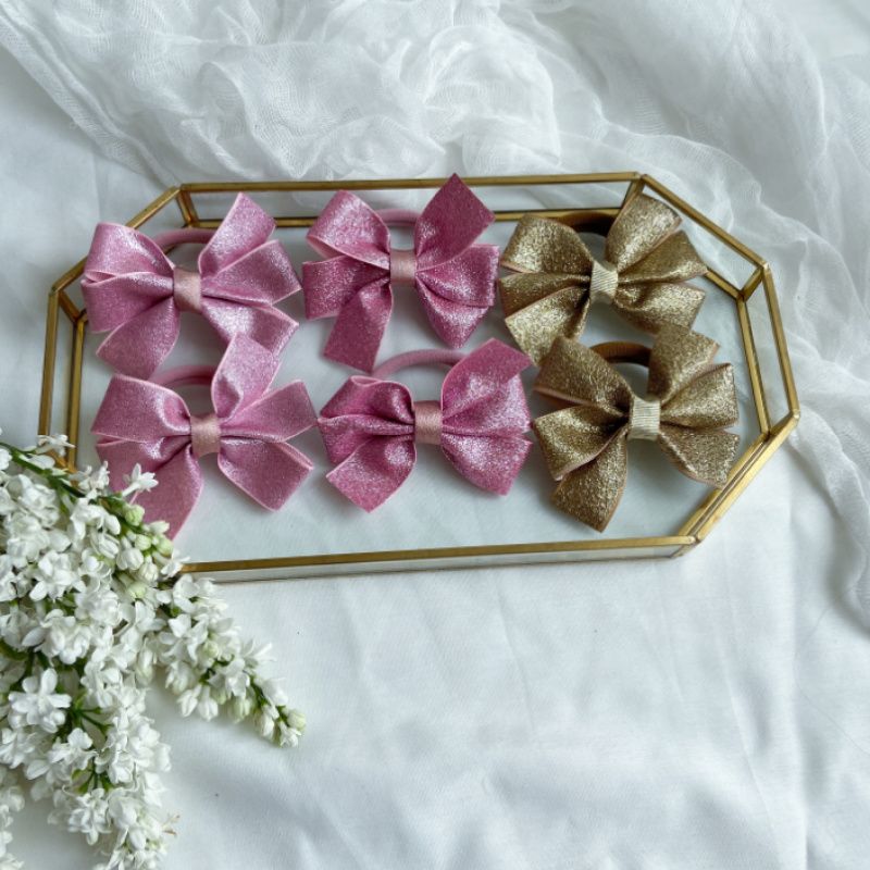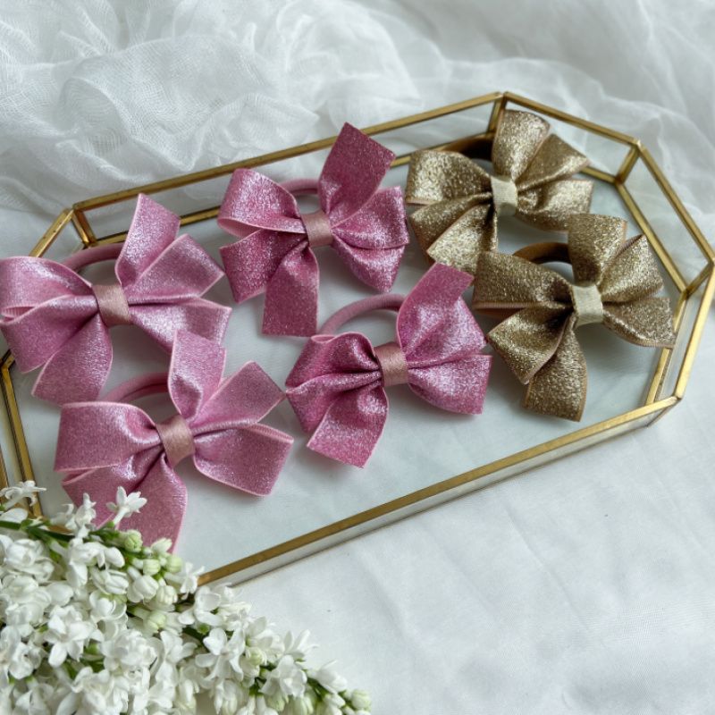 Классические бантики сделаны из верь ленты с блестками, не осыпаются .. Сделанные с одной слоя ленты. Крепеж-резинки бесшовные. Цена указана за набор. Размер бантика 7см.