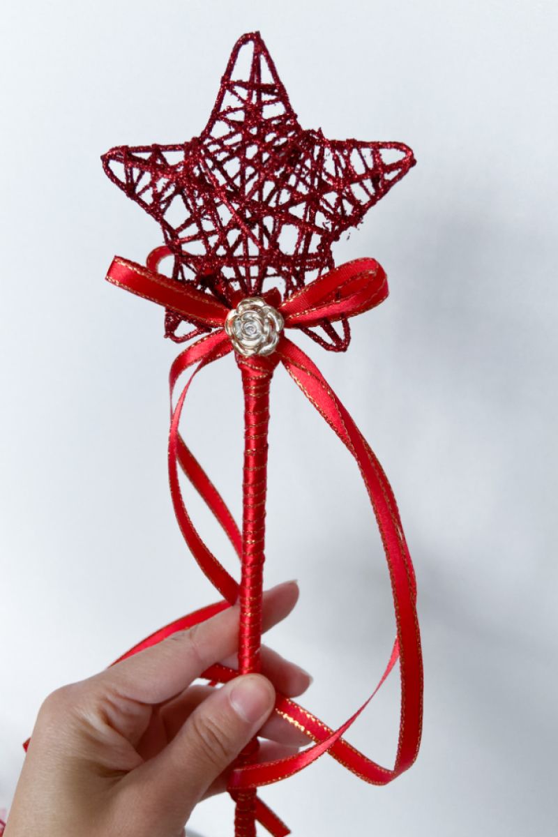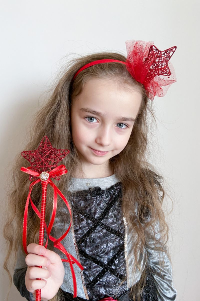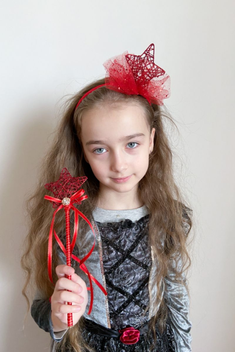Непревзойденный обруч и палочка звездочки подчеркнут образ красавицы. Обруч-каучук, обмотанный парчой. Звезда-металлическая с серебряной нитью. Юбочка сделана из серебряной сетки. Хорошо выбликает при искусственном и денном свете.