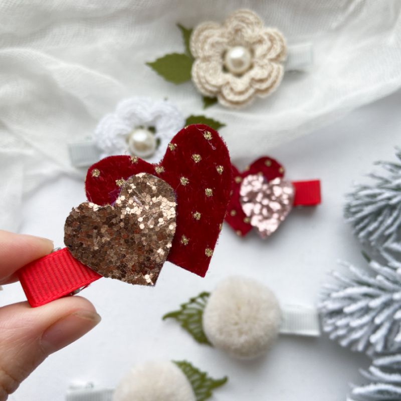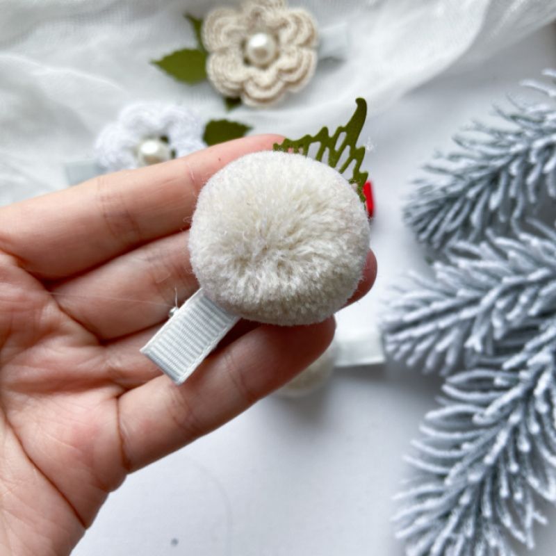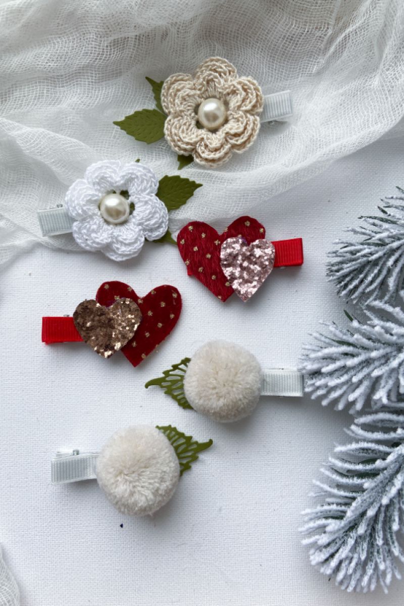 Набор заколок.Помпоны,цветы и пушистые сердечки.