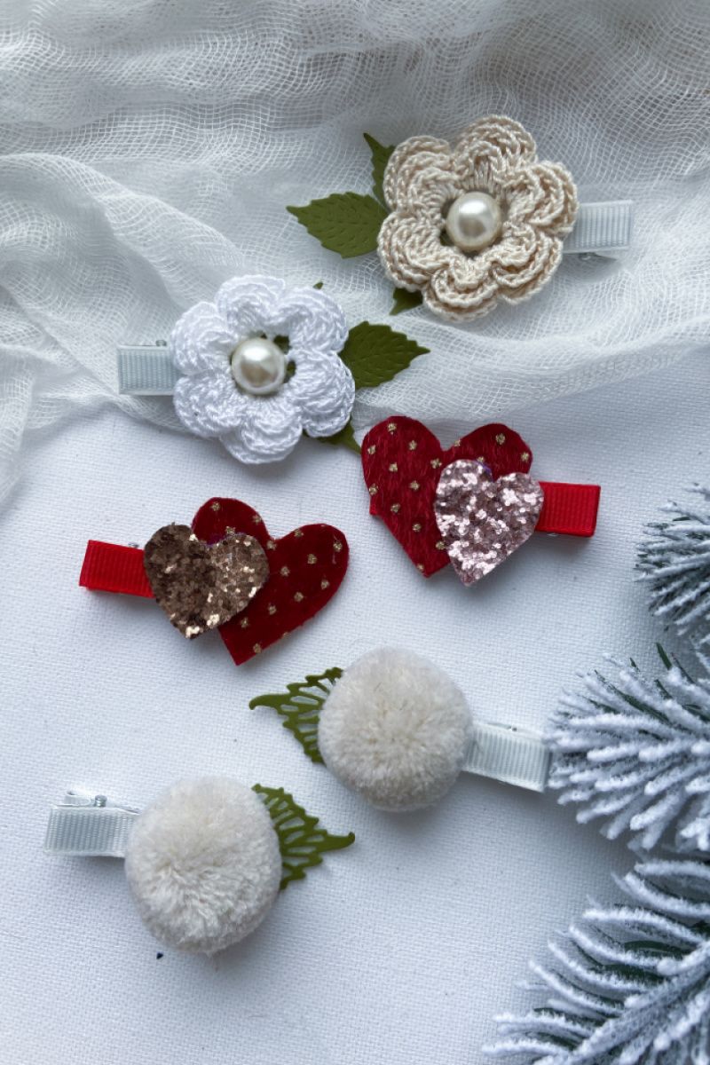 Оригинальный набор для маленькой модницы. Цена указана за набор. В набор входит: заколки-цветы вязаные из экокожи листочком, заколки с помпонами из нитей и пушистые сердечки.Набор в 1 экзепляре.