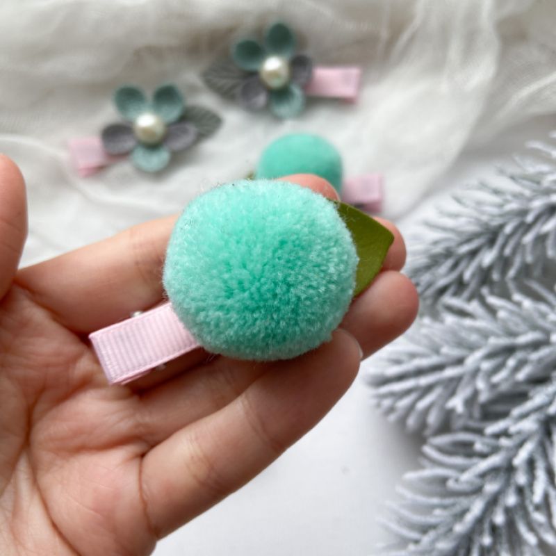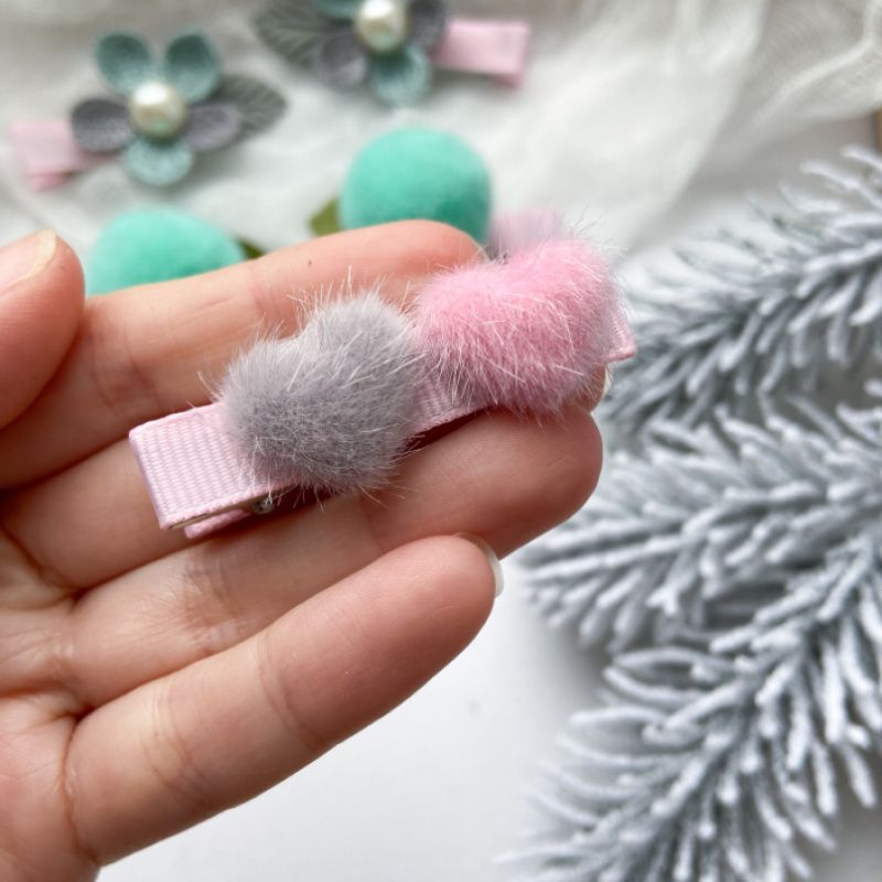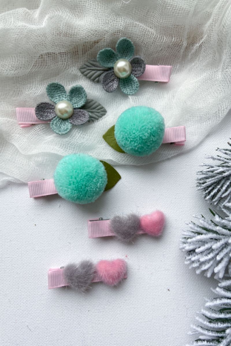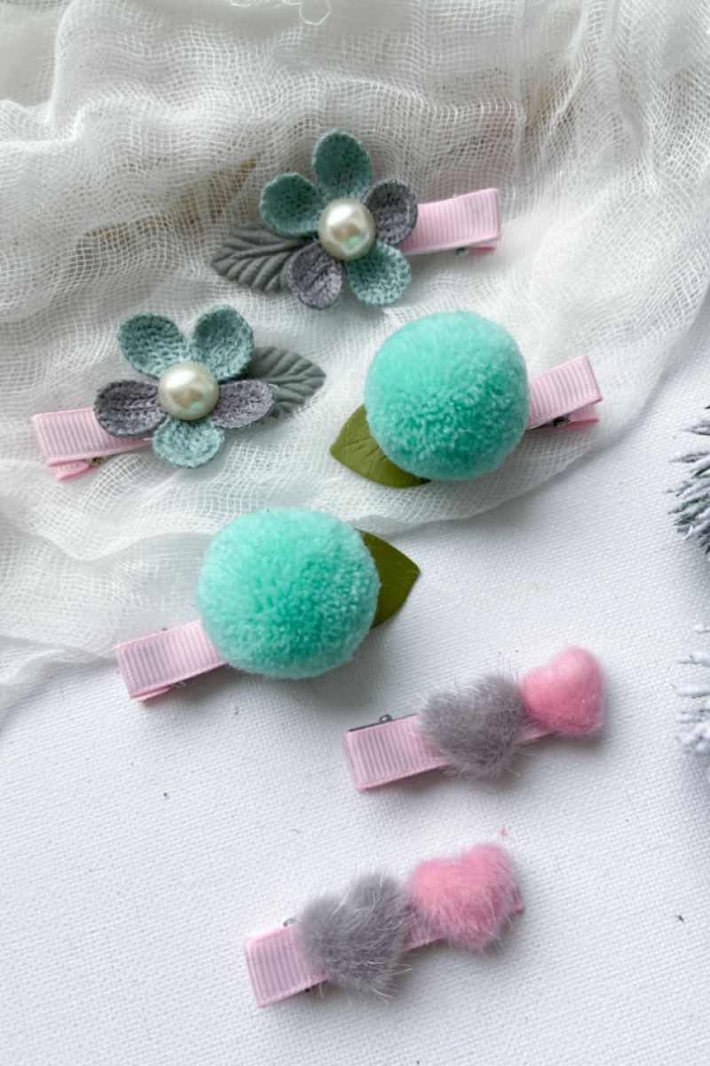 Набор заколок.Помпоны,цветы и пушистые сердечки.