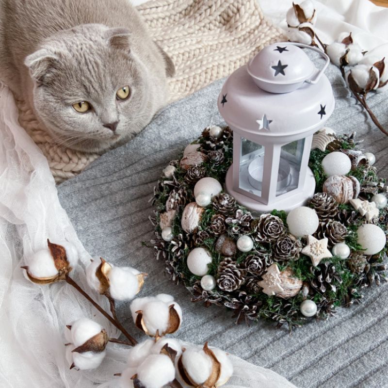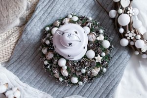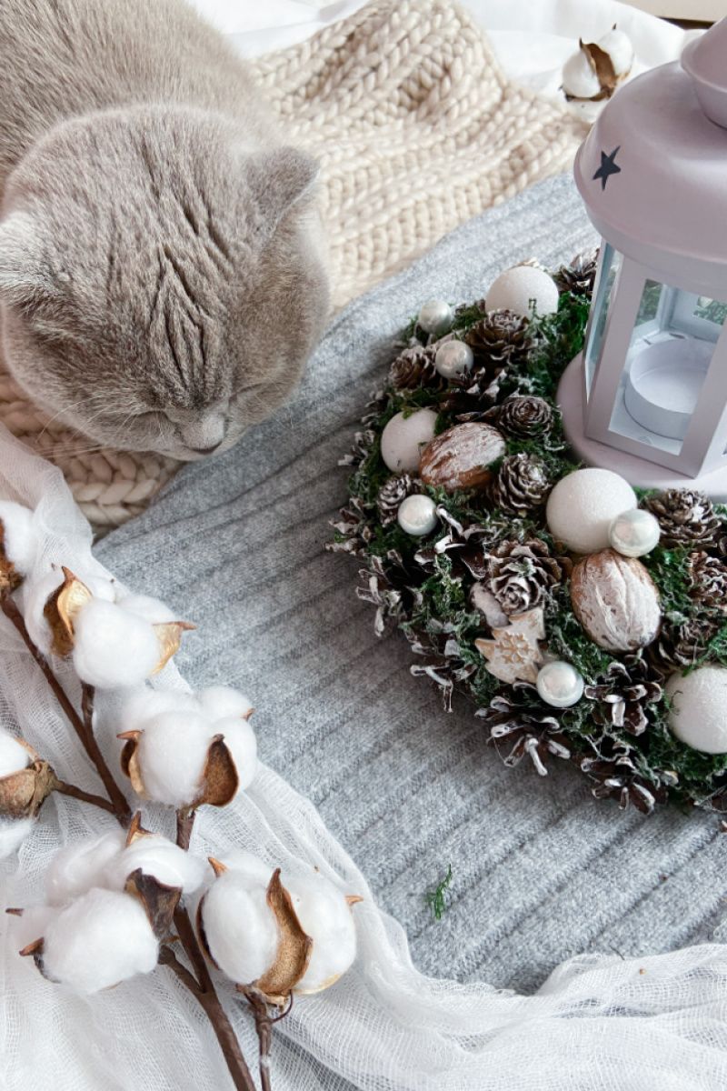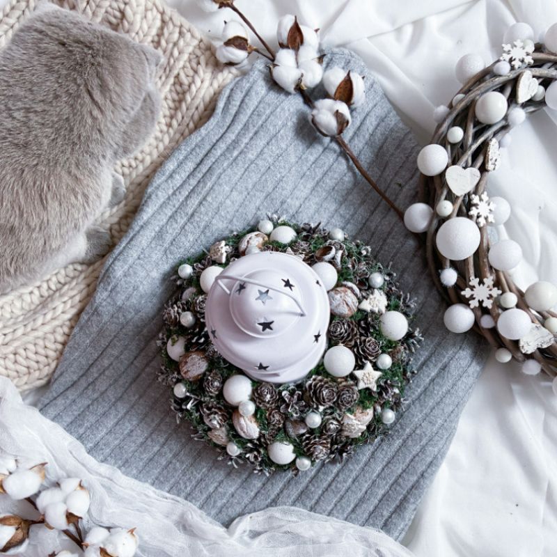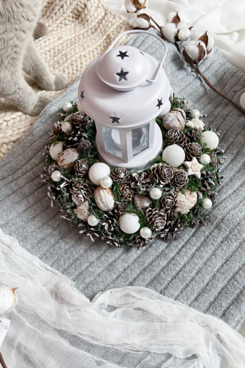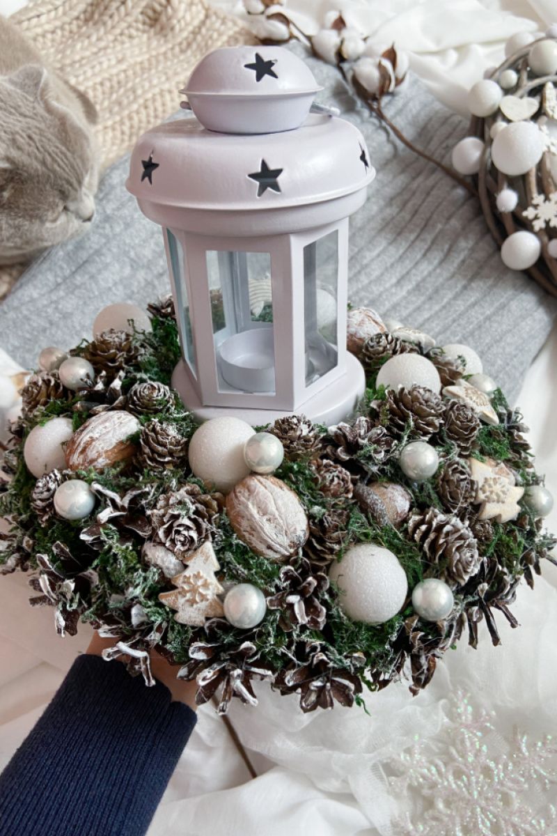 Новогодний подсвечник в белом. Невероятно смотрит в интерьере. Подсвечник-металлический со стеклянными окошками. Можно внутри поставить гирлянду или свечу. Основа сделана из шишек, желудей, орехов, мха, шаров и керамическими елками и звездочками. Произведено эффектом заснежения. Параметры высота 21 см ширина 27 см