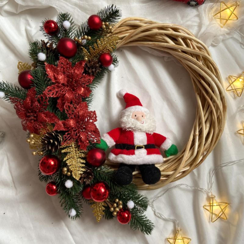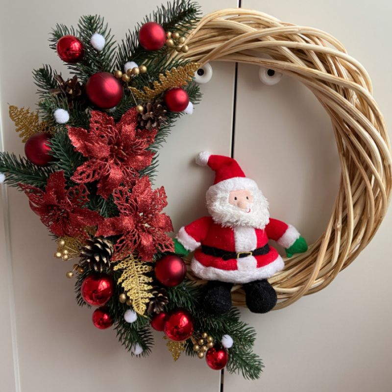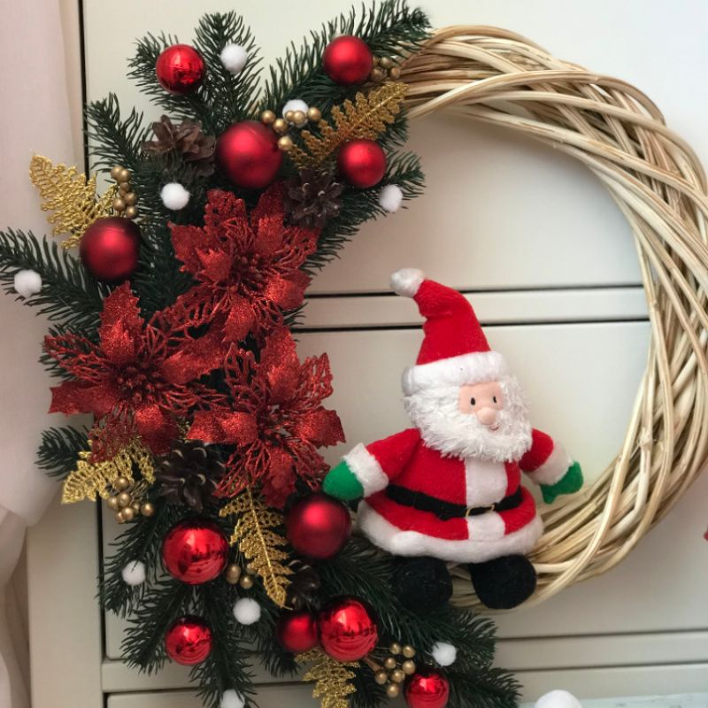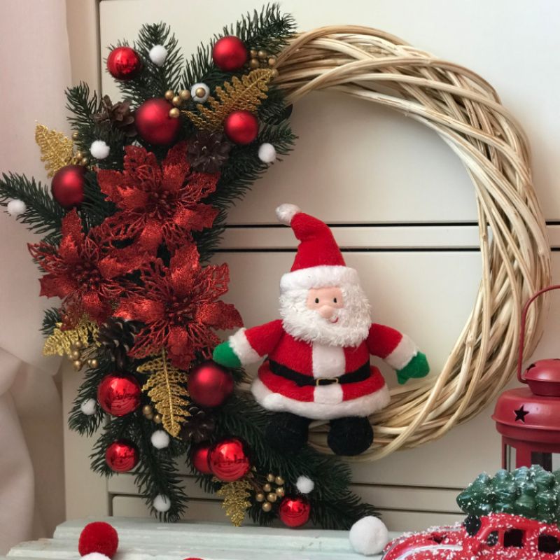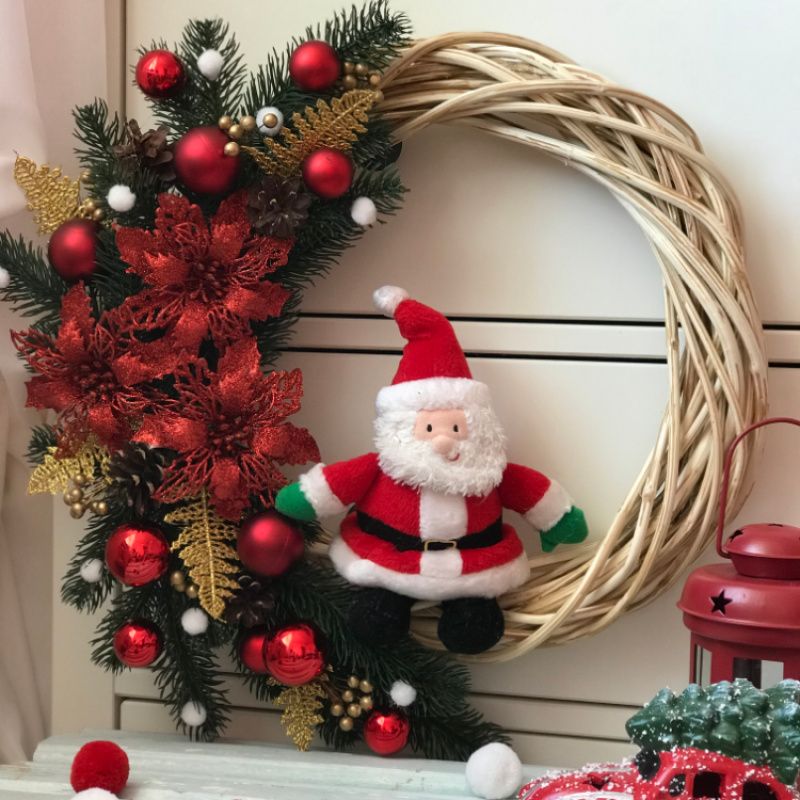 Пора готовиться к праздникам. Этот венчик принесете позитив и уют Вашему дому. Размер 43х50 см. Сплетенный из лозы и украшенный хвоей, шарики пластик, помпонами, блестящими ветвями и блестящими цветочками. И сиденье сидит себе дед мороз