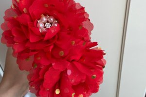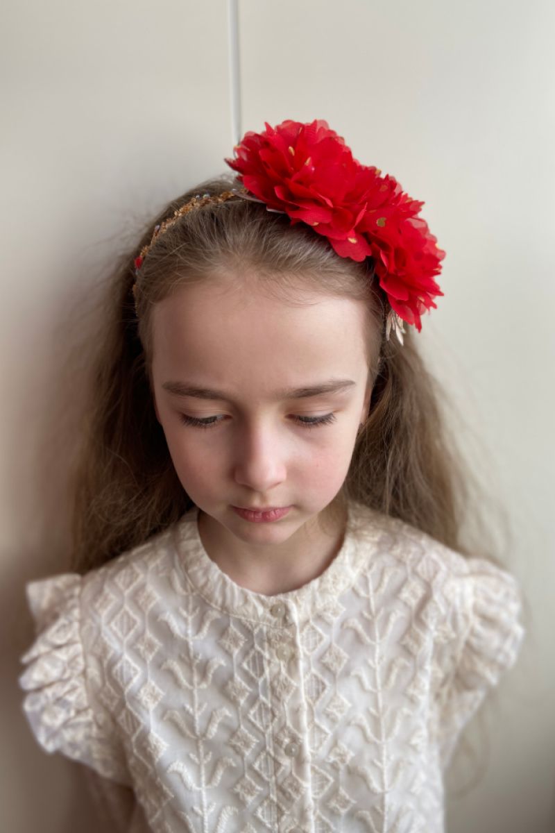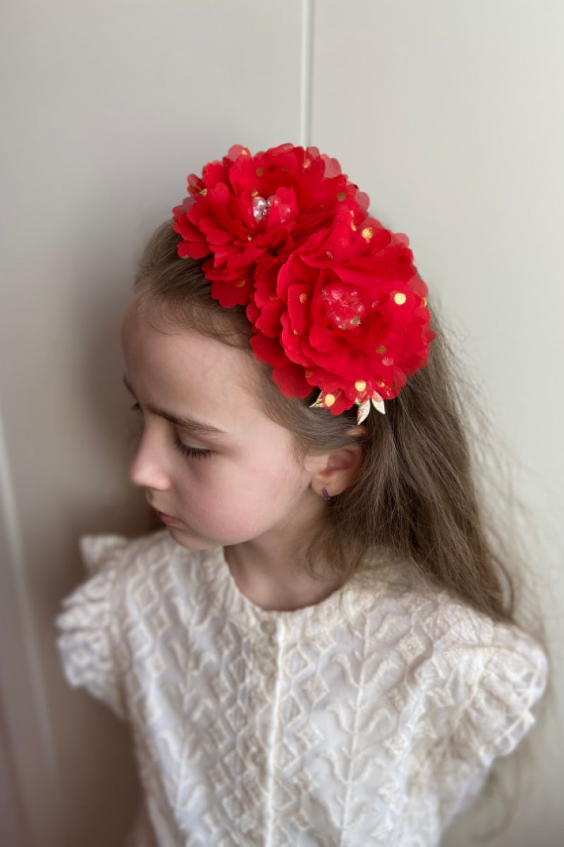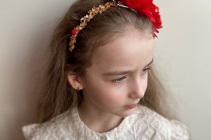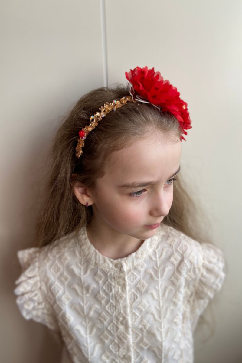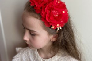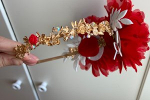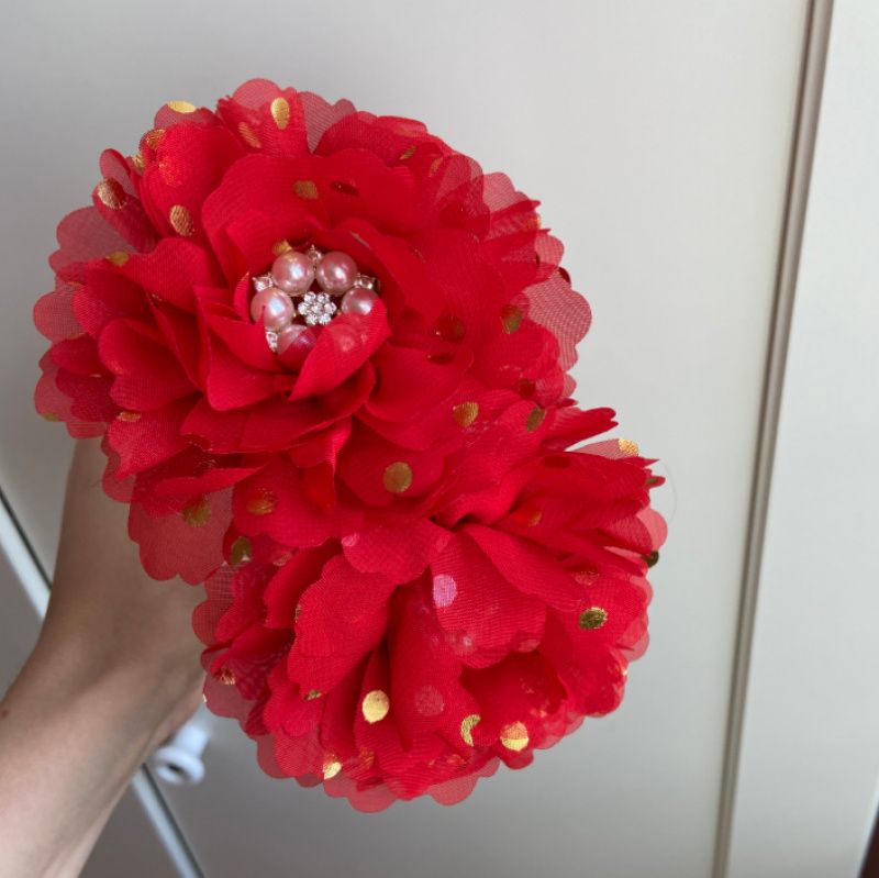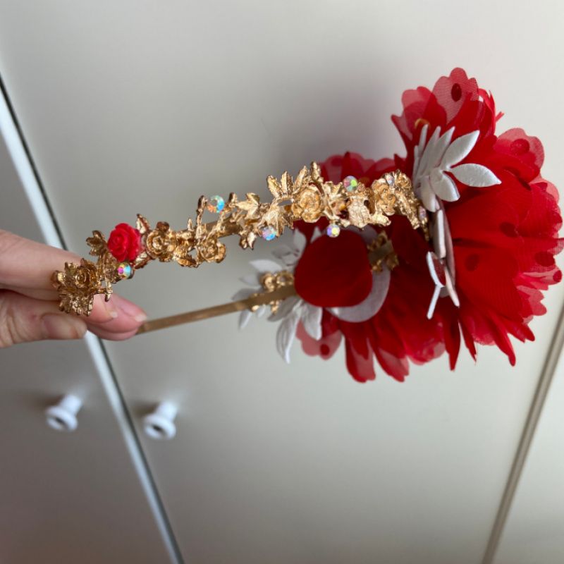 Обрчуч - металлический. Имеет Матело вставки с цветами. Украшенный стразами, розами. Сбоку композиция из цветов из ткани. В середине цветочки стразы. Сбоку украшают листочки из экокожи.