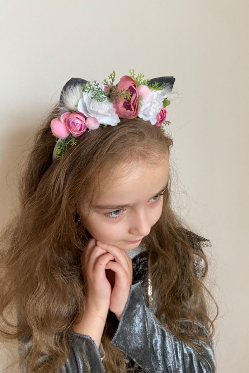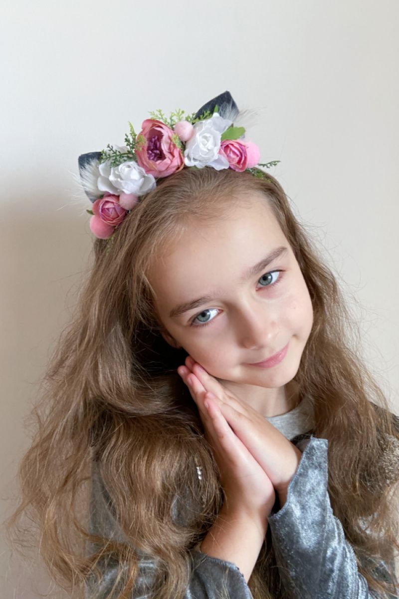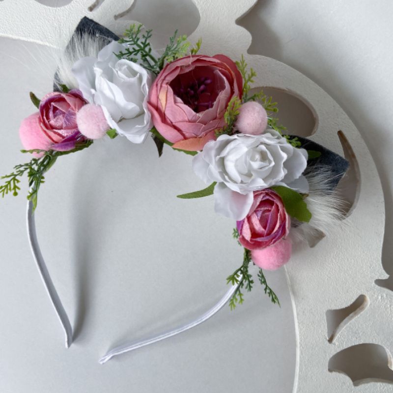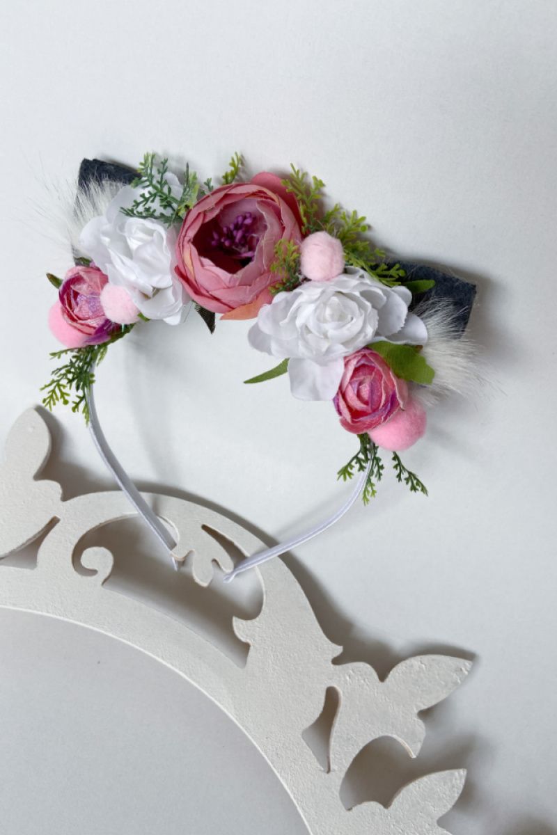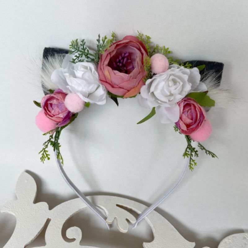 Обруч-металлический. Ушки сделаны из меха и меха. Украшенные цветами из ткани