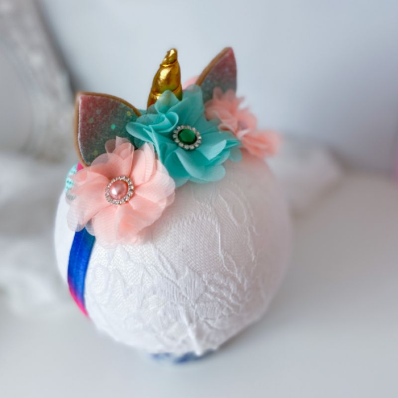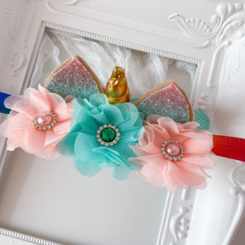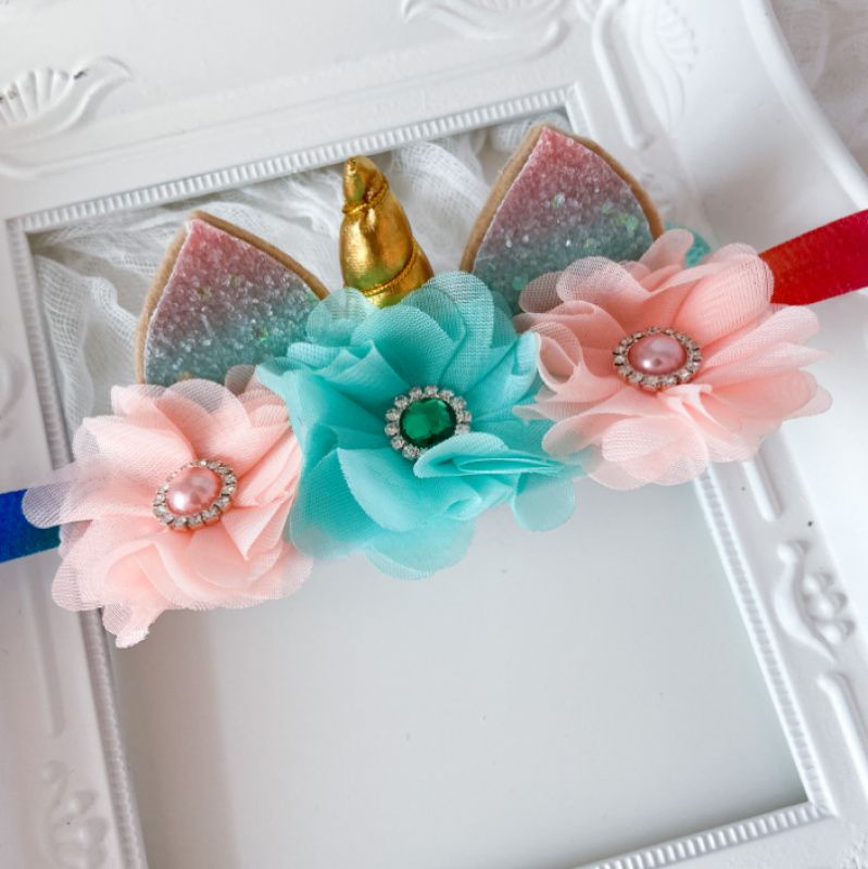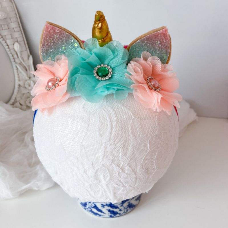 Оригинальное повязочка для маленькой красинни.Пидийде для свияткування день рождения, фотосессии или для игры. Ушки сделаны из фетра и блестящего кожзамы, цветы из ткани, рог-из искусственной кожи. Украшенный помпонами.Основа эластичная резика, не тянет головы. Подходит от обхвата головы 46 см (6 месяцев) до 3-х лет.