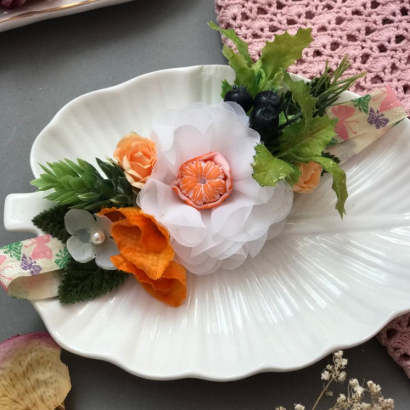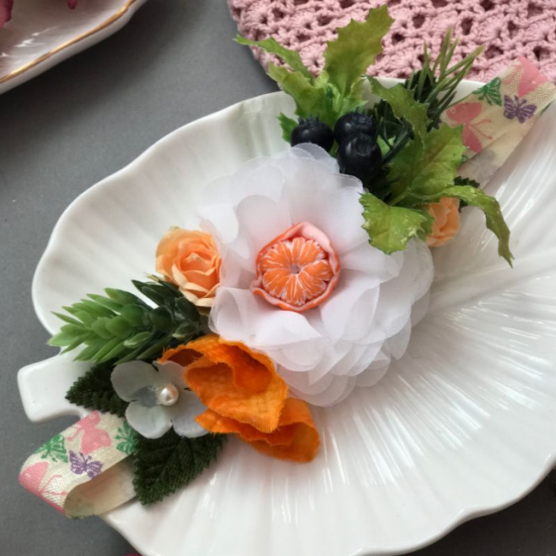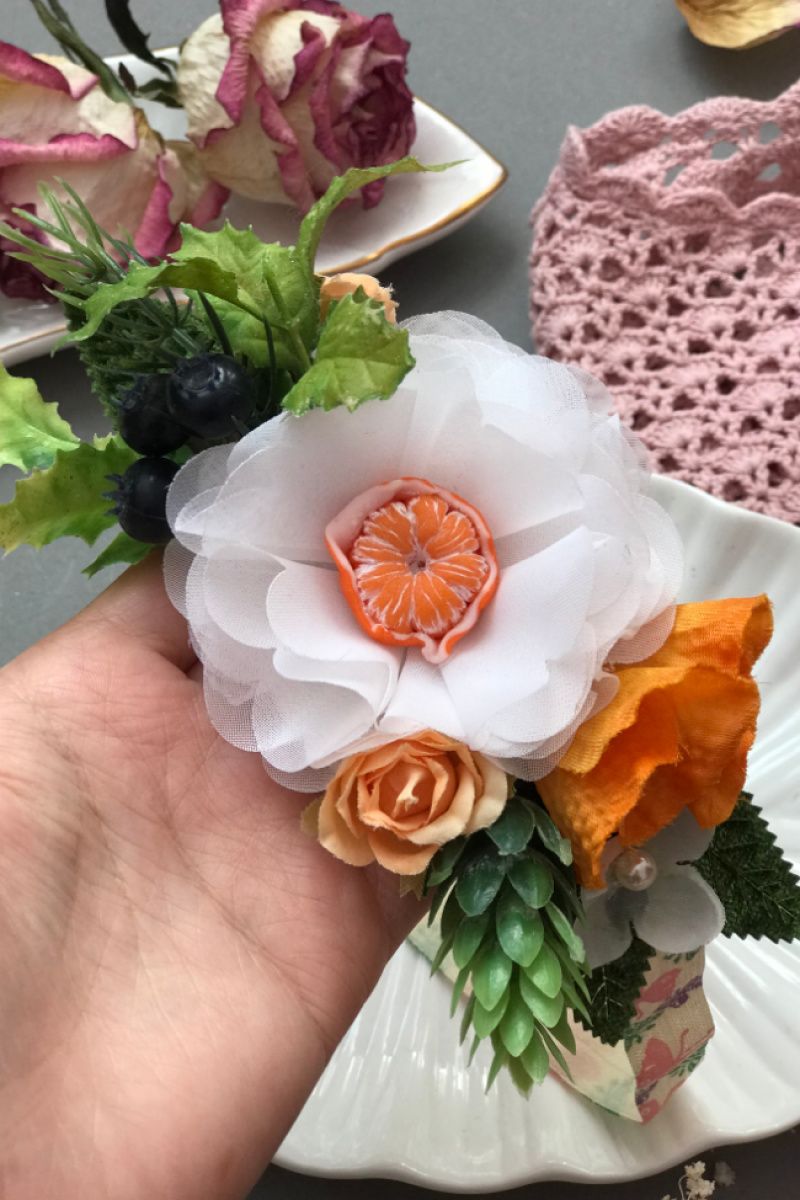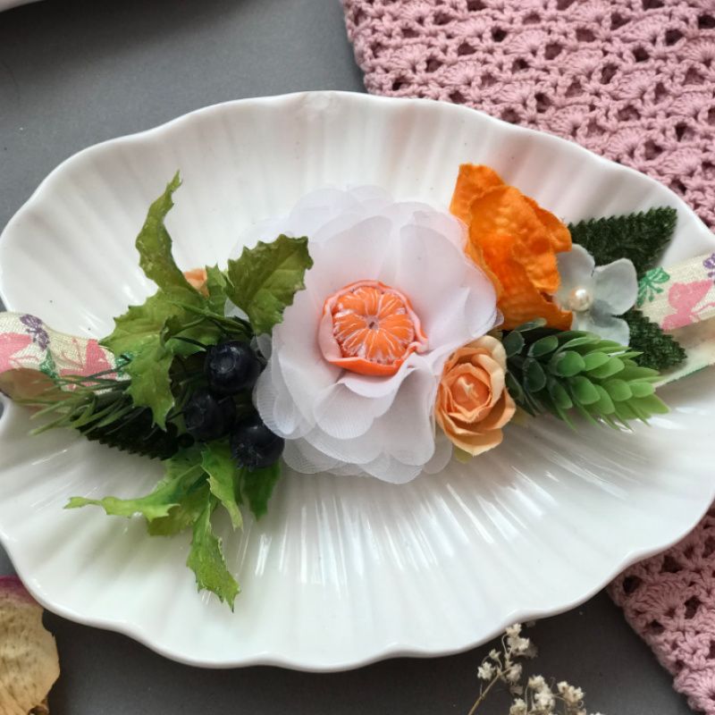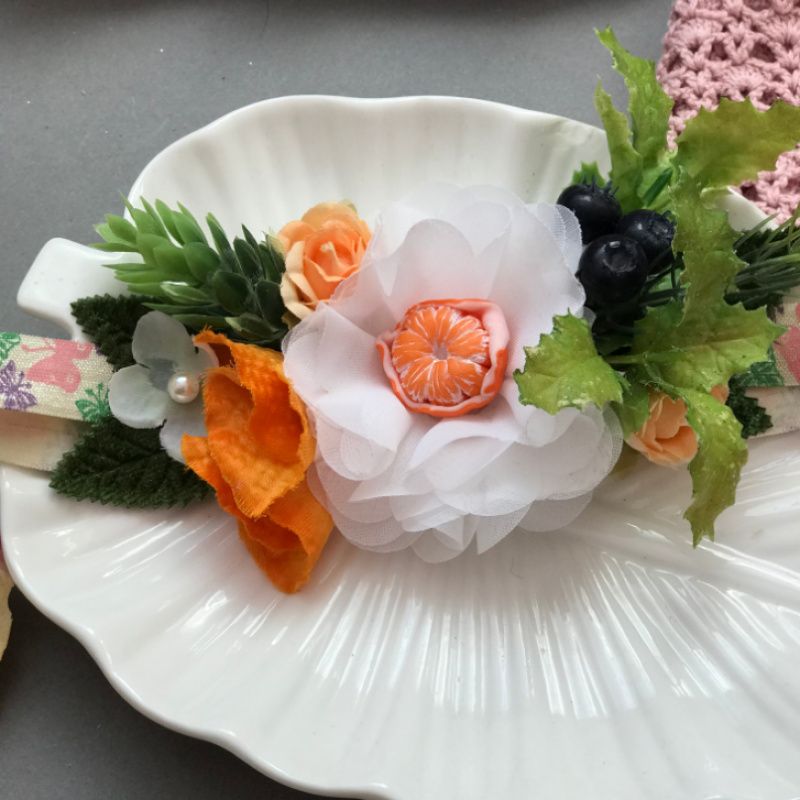 Яскрава,соковита повязка для красуні. Квітка зроблена в ручну з тканини,серединка полімерна глина. Прикрашена зеленю,квітами та ягодами.