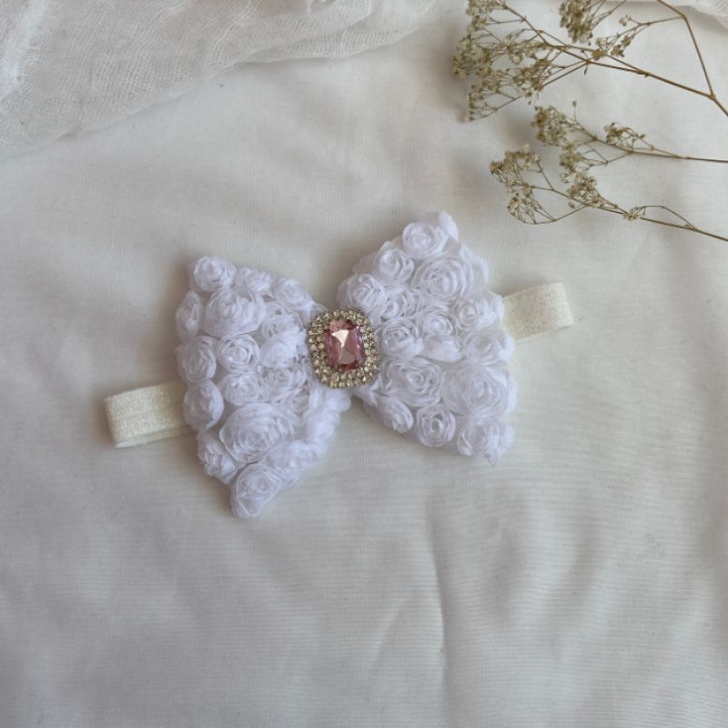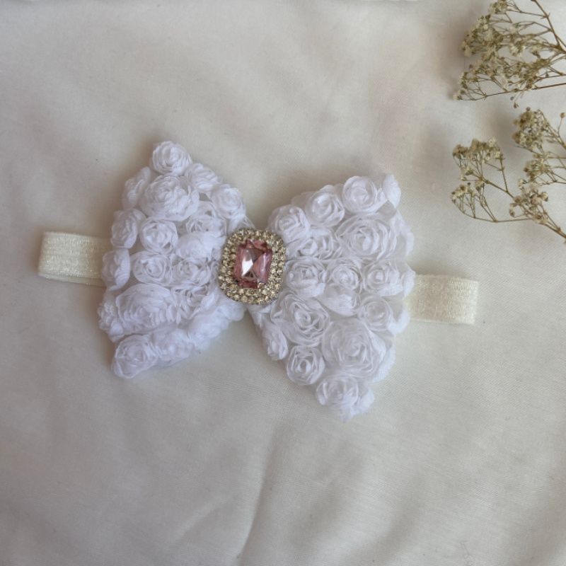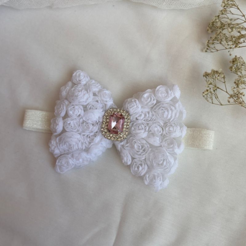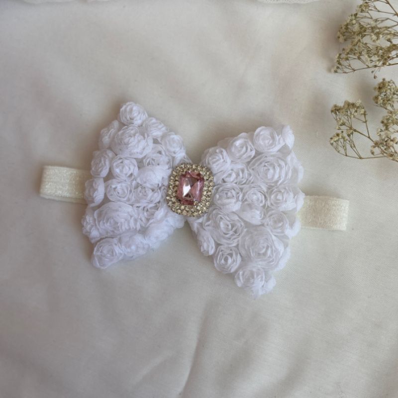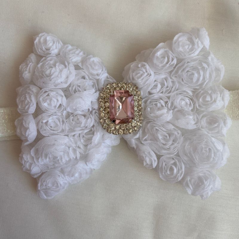 Бант сделан из фатина на котором нашиты розы. Серединка банта украшен большой брошью со стразами. Основа - елестична резинка, которая хорошо тянется и не давит головы. Бант имеет размер 10х14см. Работа в одном экземпляре