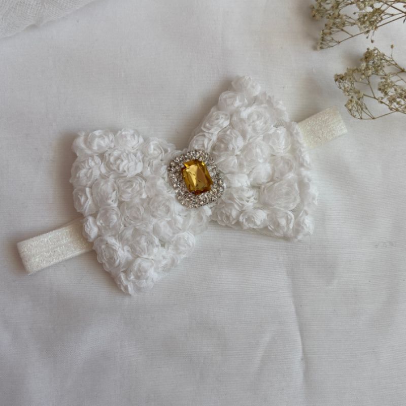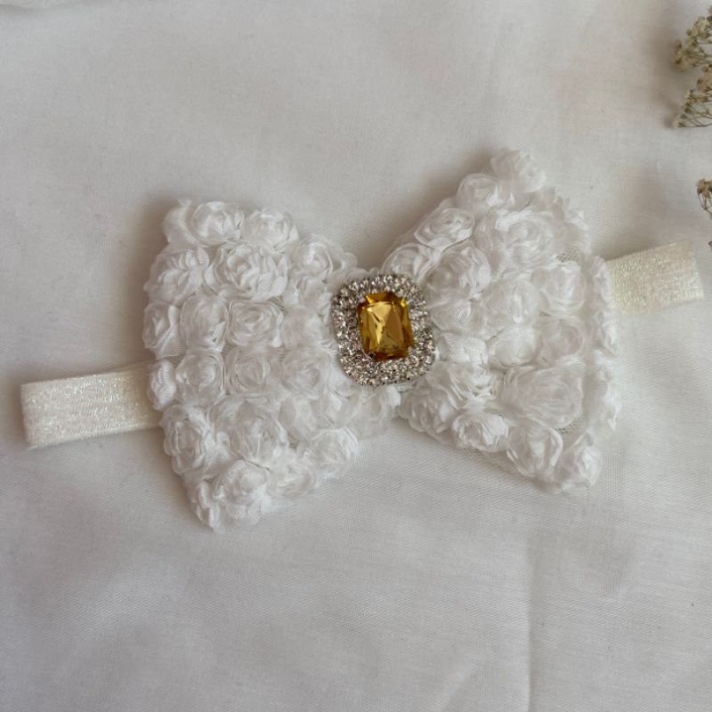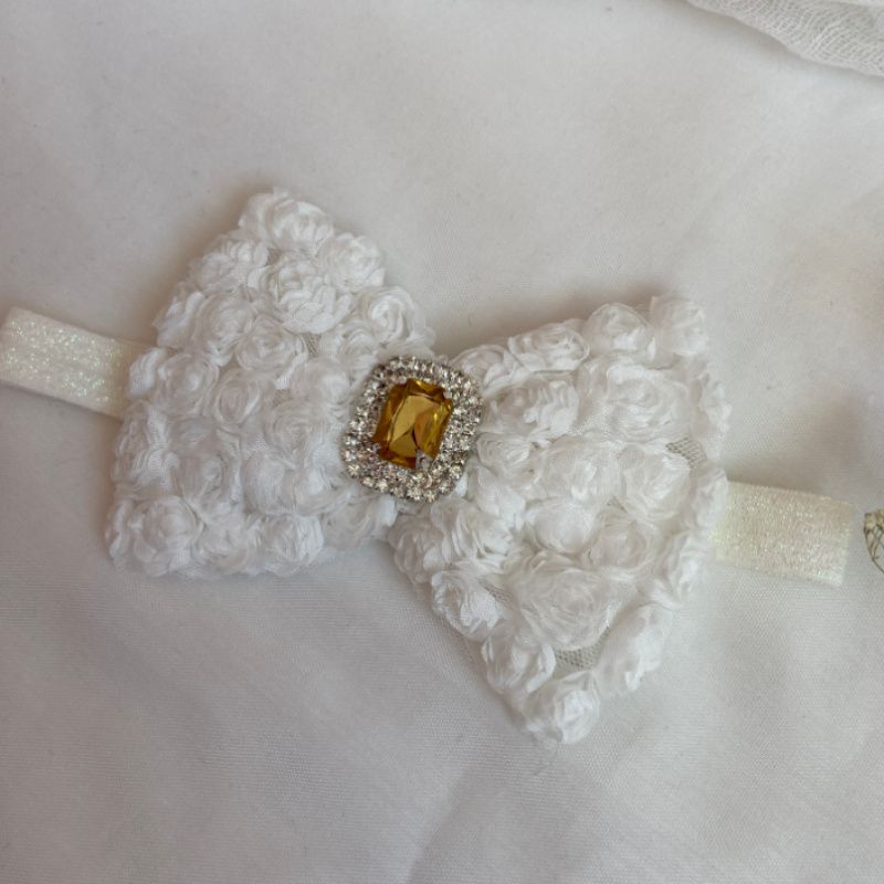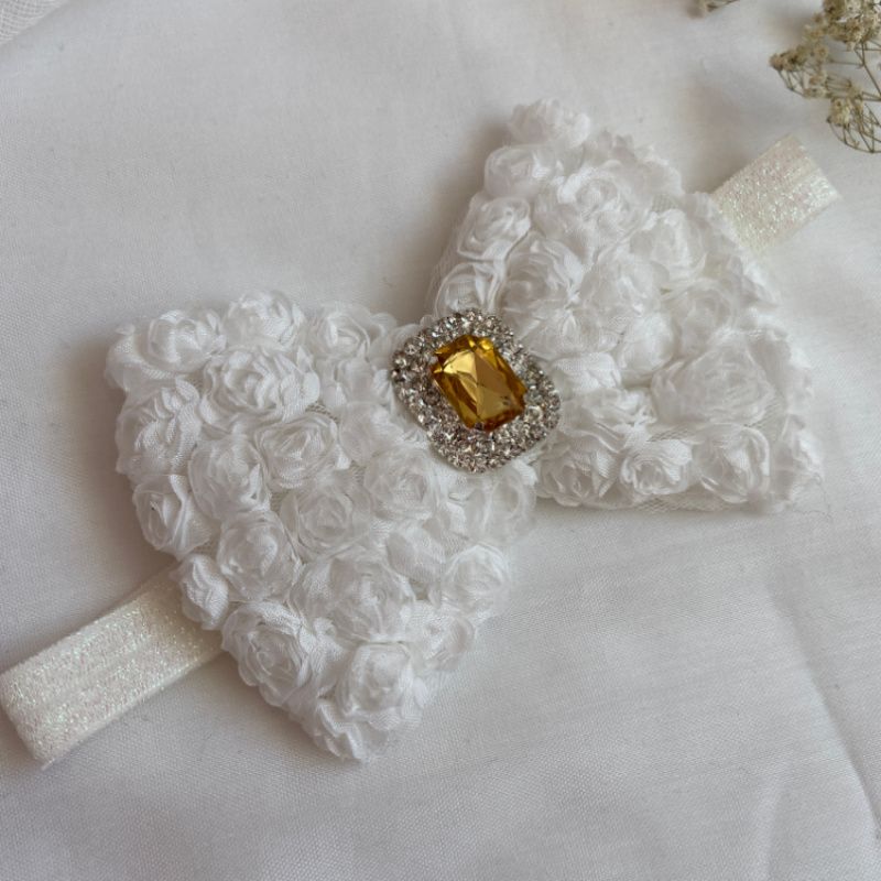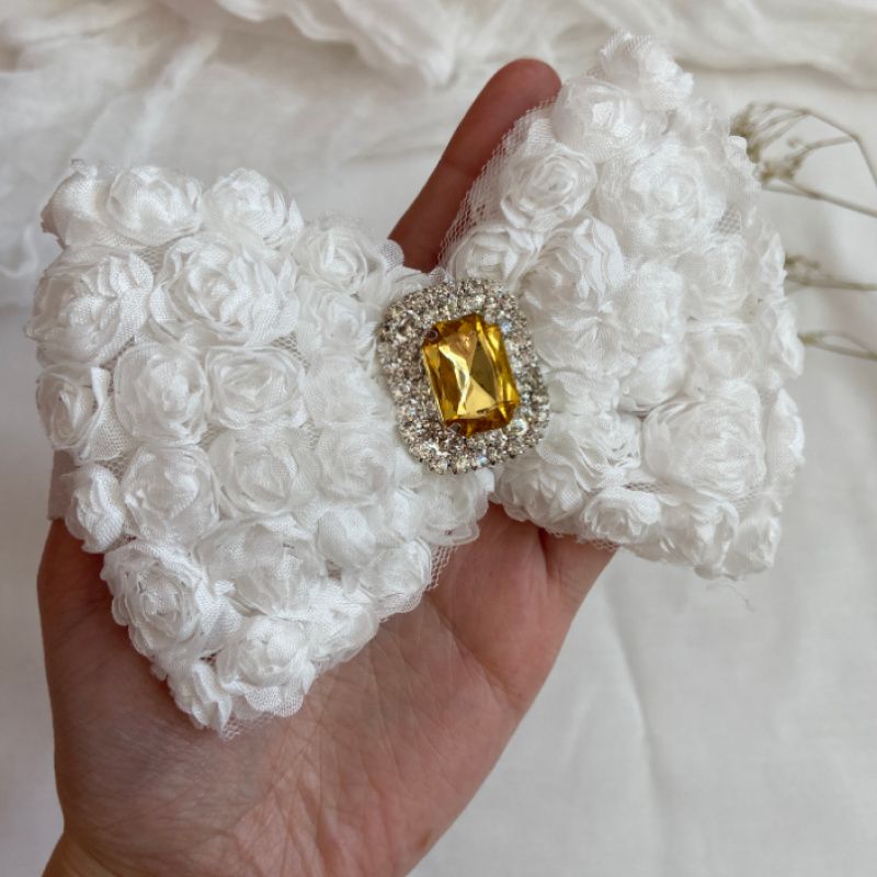 Бант сделан из фатина на котором нашиты розы. Серединка банта украшен большой брошью со стразами. Основа - елестична резинка, которая хорошо тянется и не давит головы. Бант имеет размер 10х14см. Работа в одном экземпляре