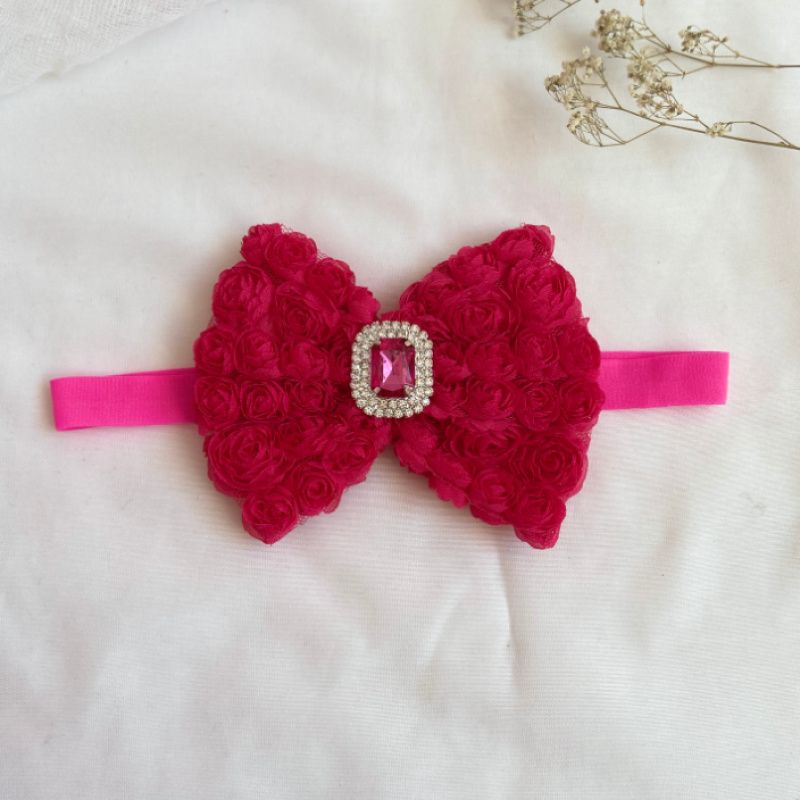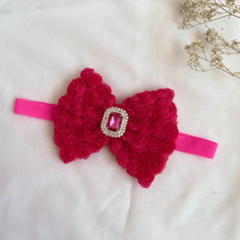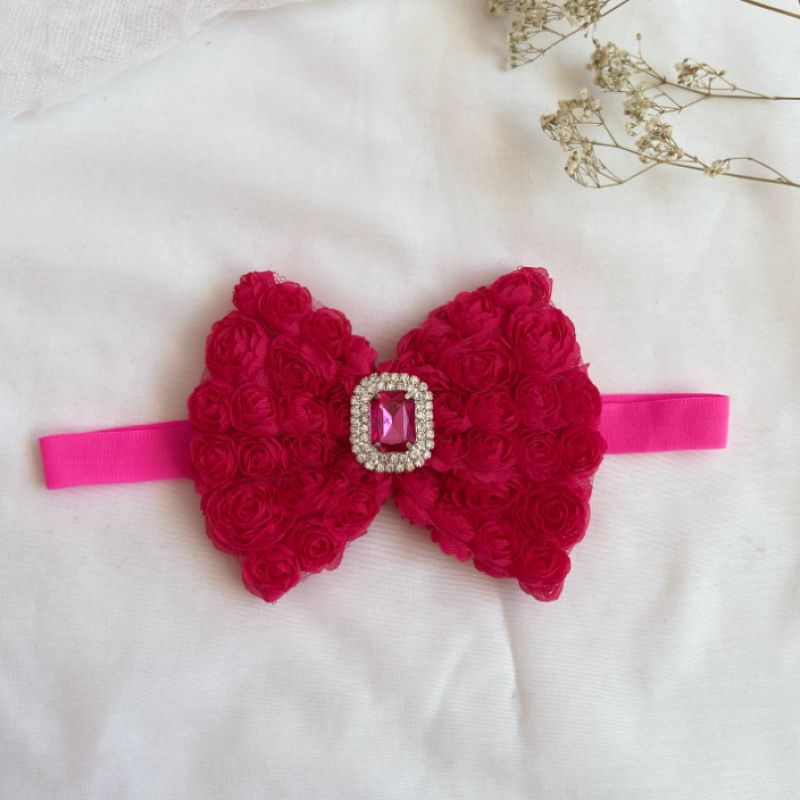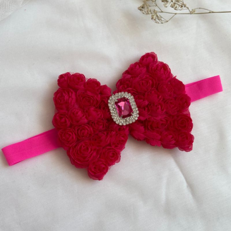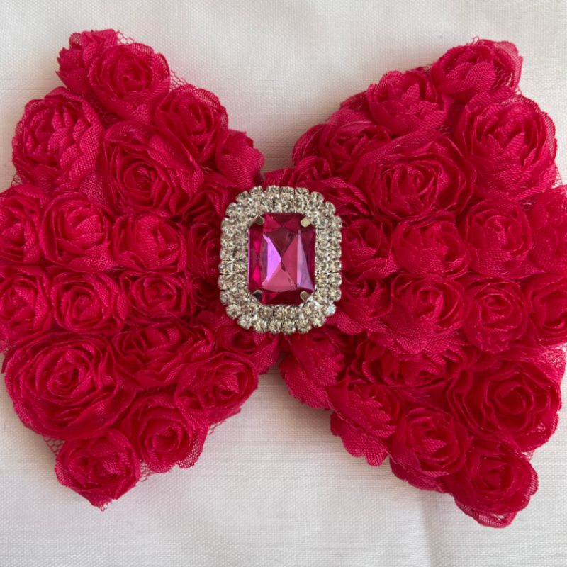 Бант зроблений з фатіну на якому нашиті троянди. Серединка банта прикрашений великою брошкою зі стразами. Основа - елестична резинка,яка добре тягнеться і не тисне голови . Бант має розмір 10х14см. Робота в одному екземплярі