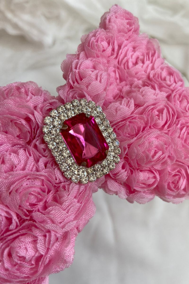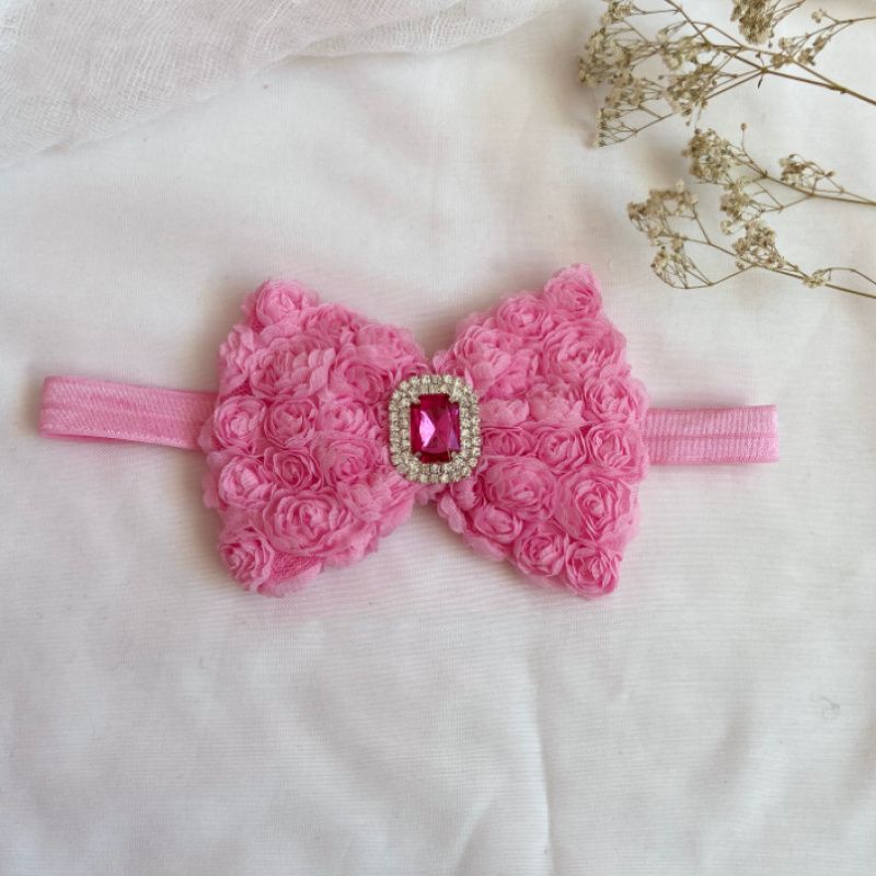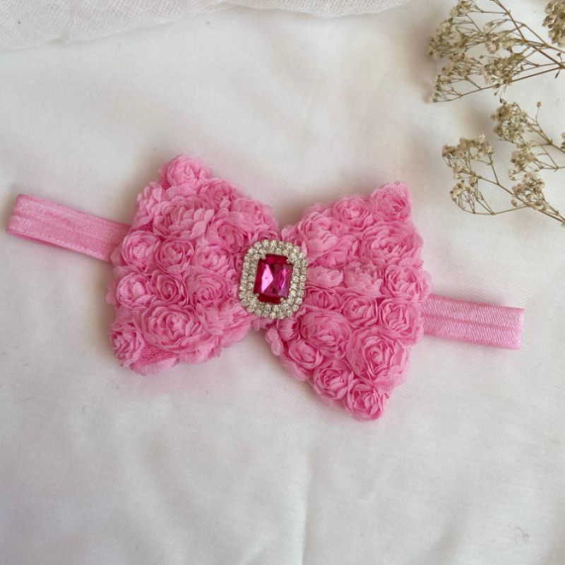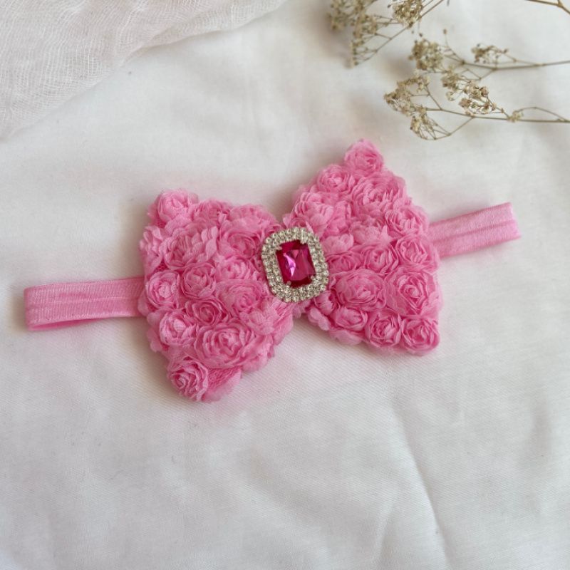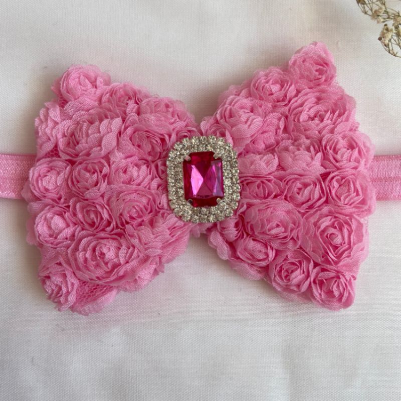 Бант сделан из фатина на котором нашиты розы. Серединка банта украшен большой брошью со стразами. Основа - елестична резинка, которая хорошо тянется и не давит головы. Бант имеет размер 10х14см. Работа в одном экземпляре