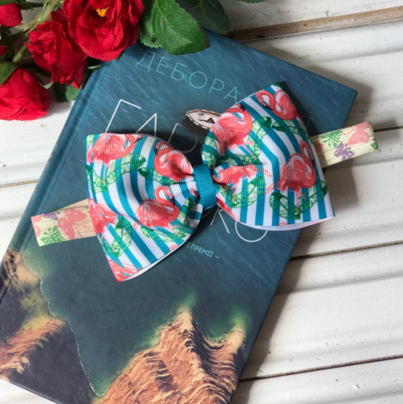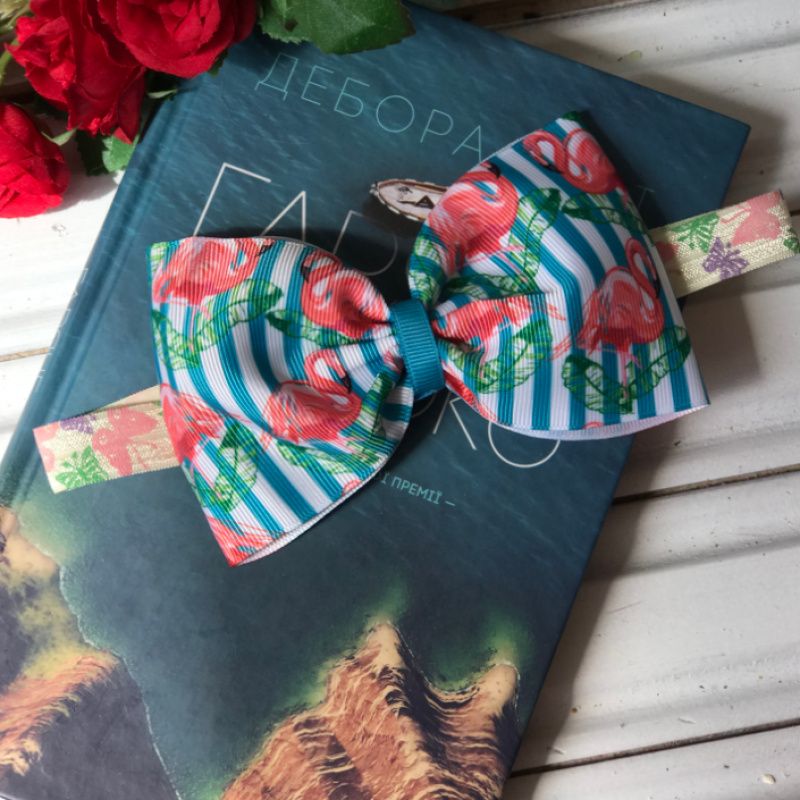 Невероятная и эффектная повязка с фламинго. Сделана из репсового ленты. Размер банта 13 см