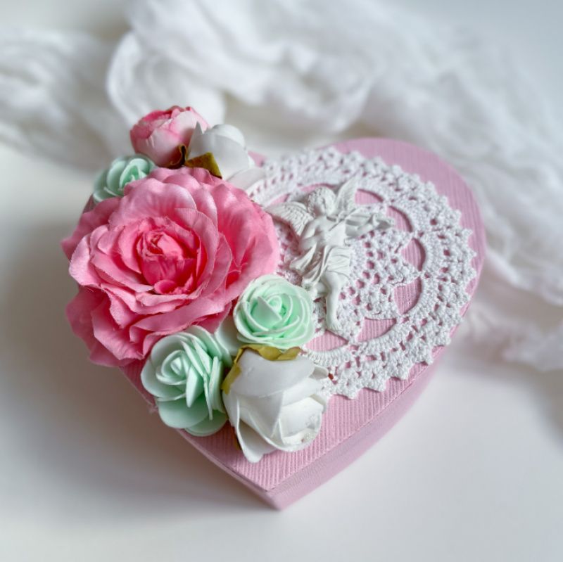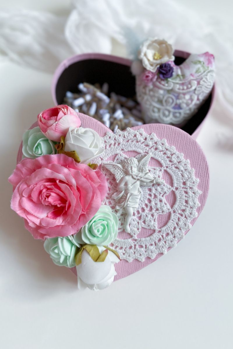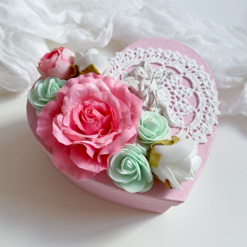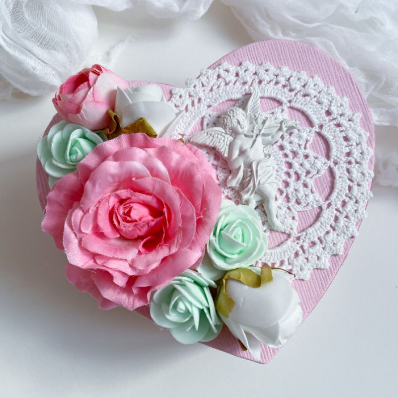 Коробочка валентинка – оригинальный и романтичный подарок на день Валентина, день рождения или годовщину. Коробочка сделана из картона. Украшена цветами из фома и ткани, связанной салфеткой и гипсовым ангелом. Размер 19х18х8см. В середине коробочки есть записки 100 причин, почему я тебя люблю (укр.язык) и сердечко валентинка. Сердце сшито из американского коттона. Подарите любимому человеку эмоции. Она будет поражена. Коробочку можно потом использовать как шкатулку для хранения приятных погодных условий. А сердечко можно украшать комнату, елку или использовать для романтической фотосессии. Будьте любимы :)