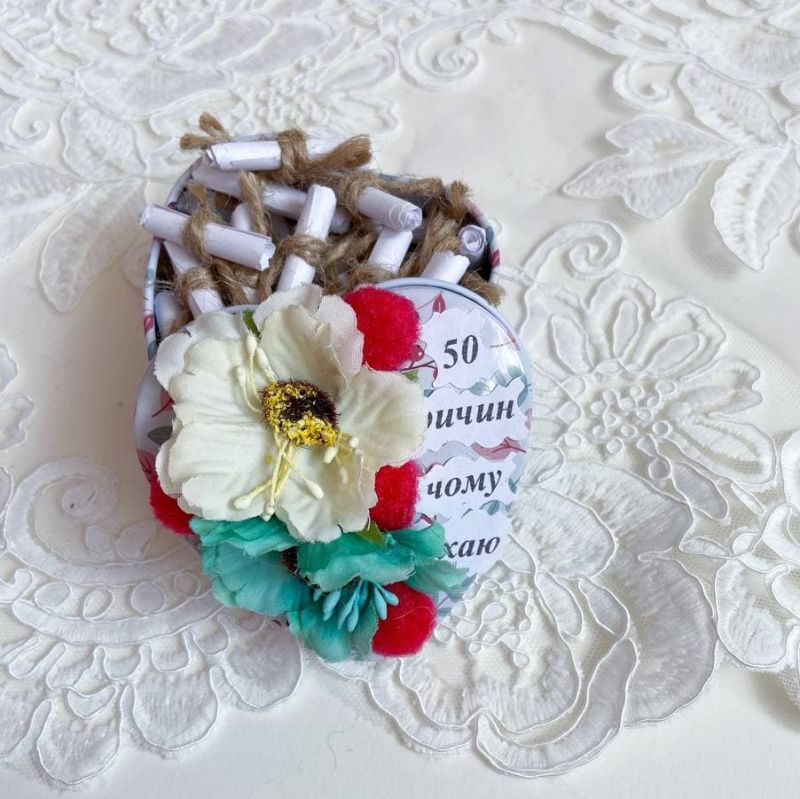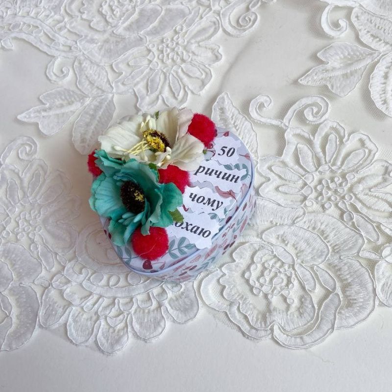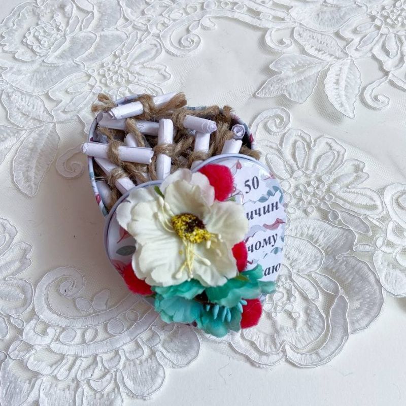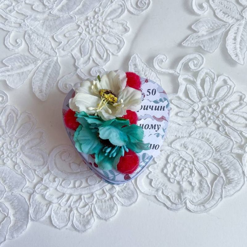 Коробочка валентинка – оригинальный и романтичный подарок на день Валентина, день рождения или годовщину. Коробочка сделана из металла. Сверху декорирована цветами, листочками. Размер 7х7х4см. В середине коробочки есть записки 50 причин почему я тебя люблю Подарите любимому человеку эмоции. Она будет поражена. Будьте любимы :).