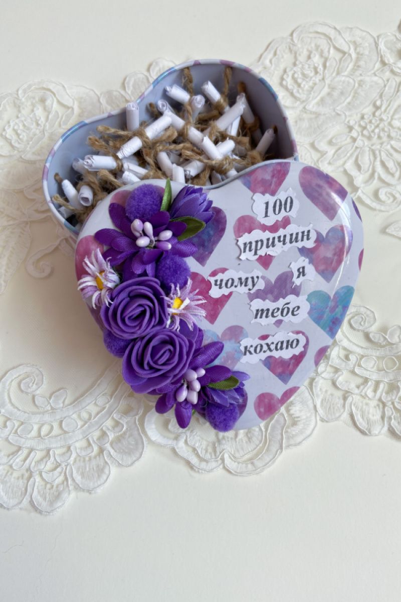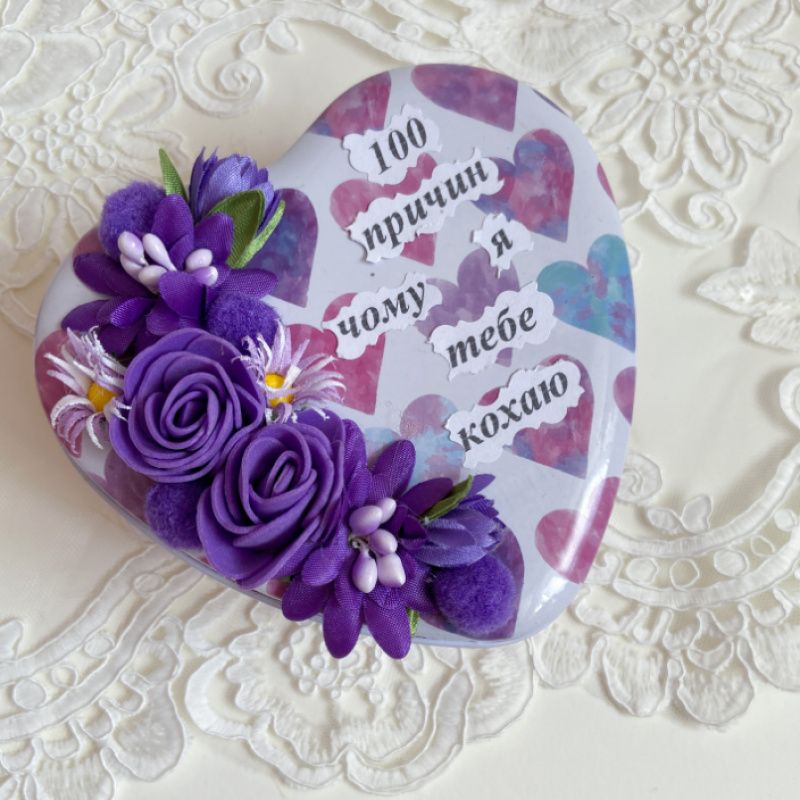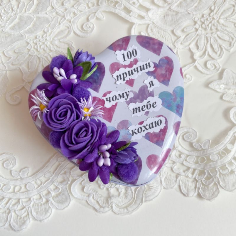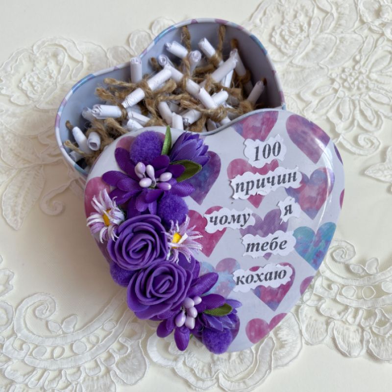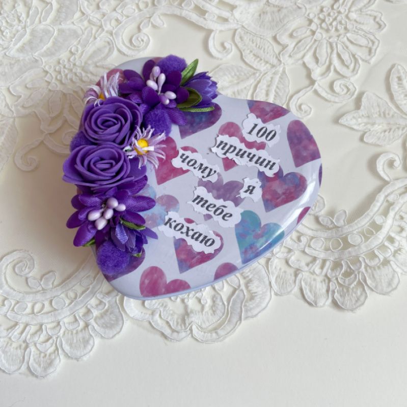Коробочка валентинка - оригинальный и романтичный подарок на день Валентина, день рождения или годовщину. Коробочка сделана из металла. Сверху декорирована цветами, листочками. Размер 12х11х6см. В середине коробочки есть записки 100 причин, почему я тебя люблю. Подарите любимому человеку эмоции. Она будет поражена. Будьте любимы :)