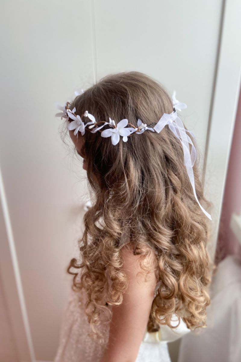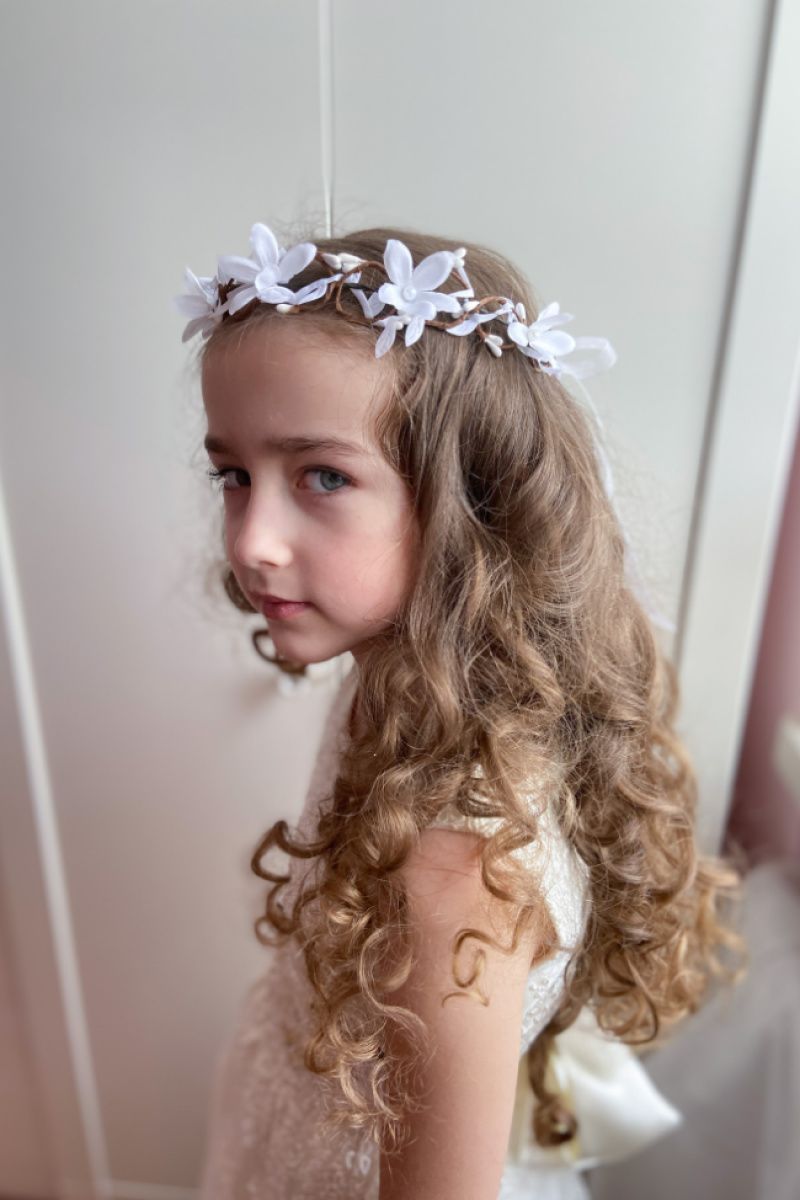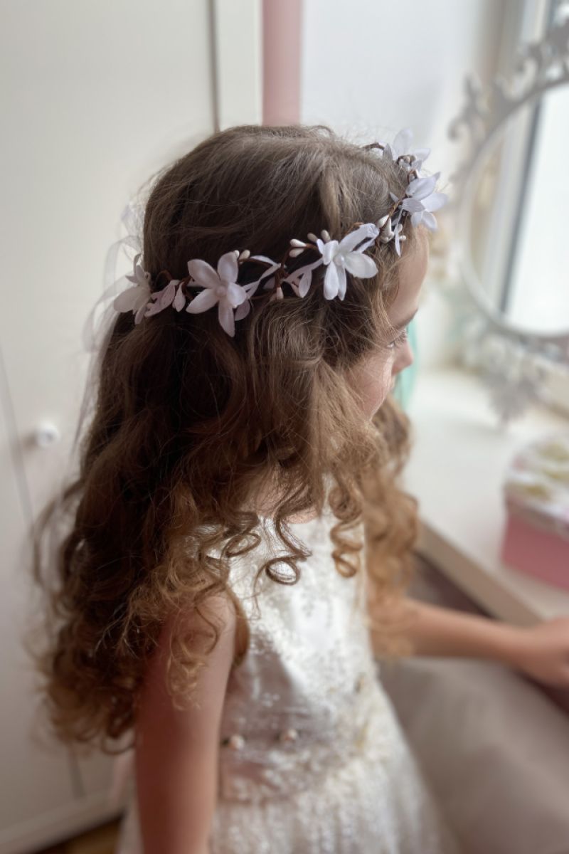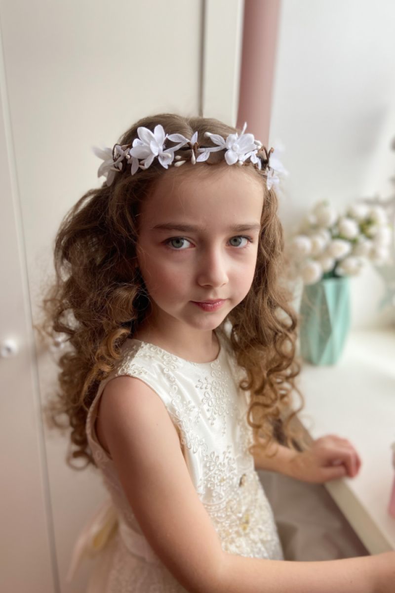 Нежный венчик для первого причастия или для свадьбы и других событий. Венок сделан из польских тканей белых цветов с серединкой цвета айвори .Збоку ткани листочки и белые тычинки. Размер венка регулируется органзовой лентой. Венок подходит взрослым и ребенку. На фото девочка с охватом головы 54 см (среднестатистический размер головы взрослого и ребенка, то есть так же будет выглядеть на взрослом).