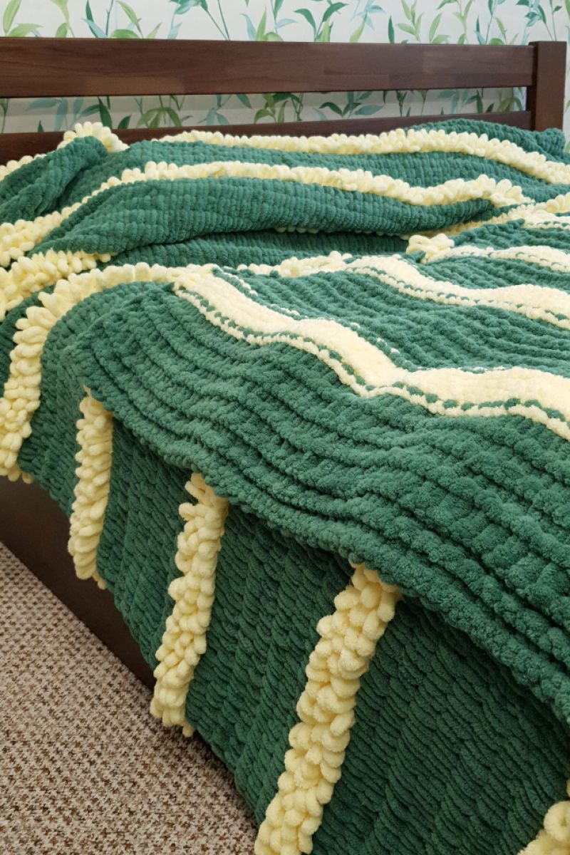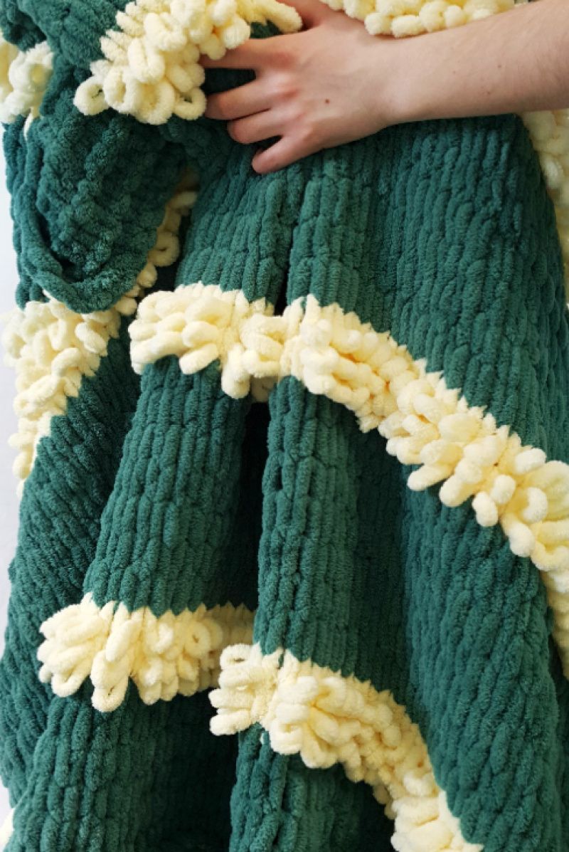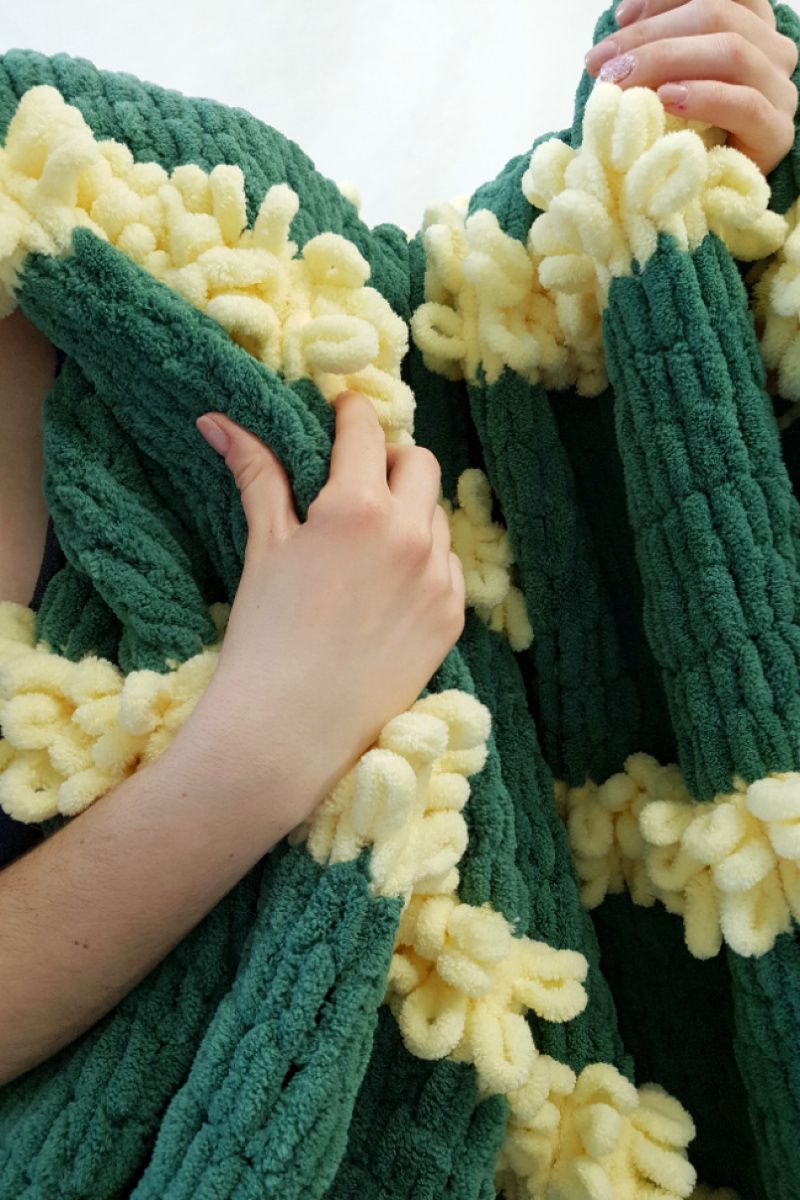 Мягкий нежный плед из плюшевой пряжи. Очень теплый и красивый. Состав: 100% микрополиэстер. Этот материал гипоаллергенный, износостойкий, теплый, мягкий, не линяет и не выгорает.
