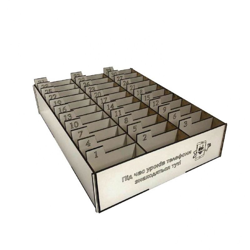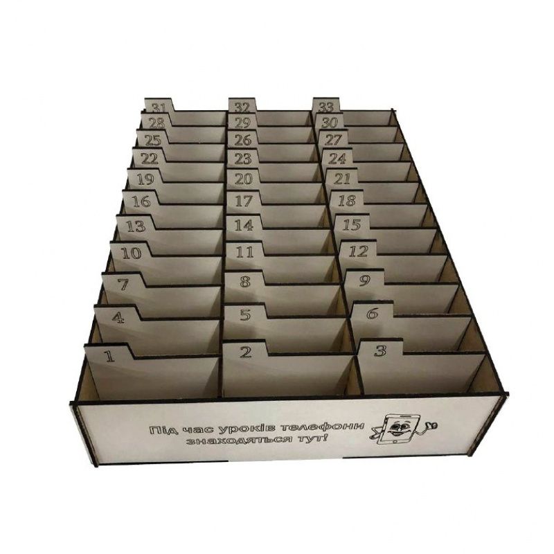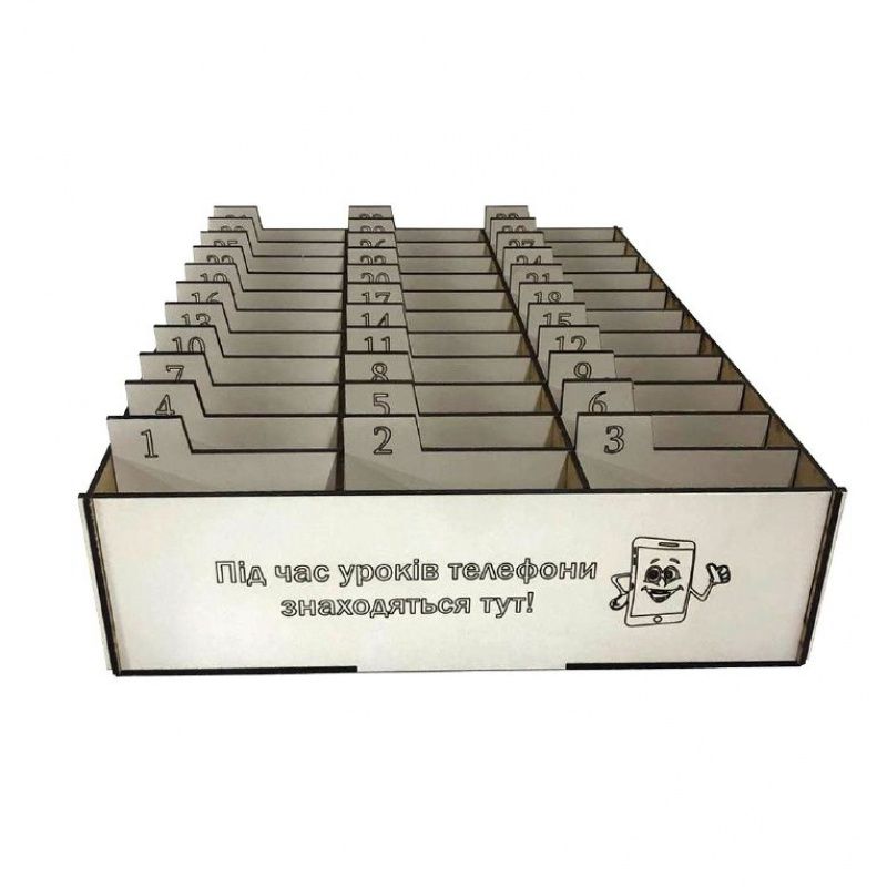 Подставка-органайзер для телефонов, смартфонов в школу, класс. Современные дети во время учебного процесса часто отвлекаются на гаджеты и не всегда усваивают материал, представленный на уроках. Прекрасным решением данной проблемы является подставка-органайзер с пронумерованными ячейками для телефонов и смартфонов. Номер ячейки соответствует номеру каждого учащегося в классном журнале, поэтому хранение мобильных устройств обеспечено, а нервы учителя останутся в порядке. В данном органайзере 30 ячеек. Размер органайзера: длина 36 см, ширина 30 см, высота 8 см. Размер каждой ячейки: 9*3*8 см. Изготавливаем под заказ коробки-органайзеры для хранения телефонов любых размеров, с разным количеством ячеек и любой надписью.