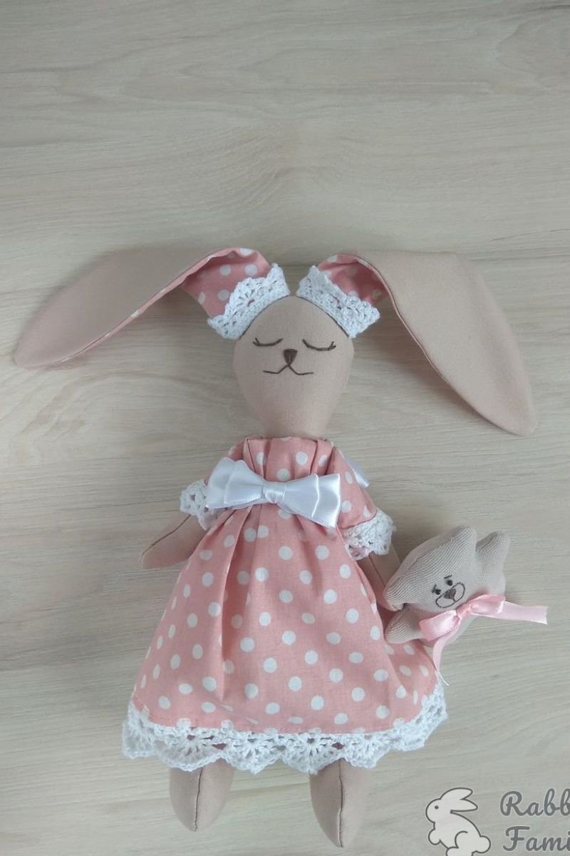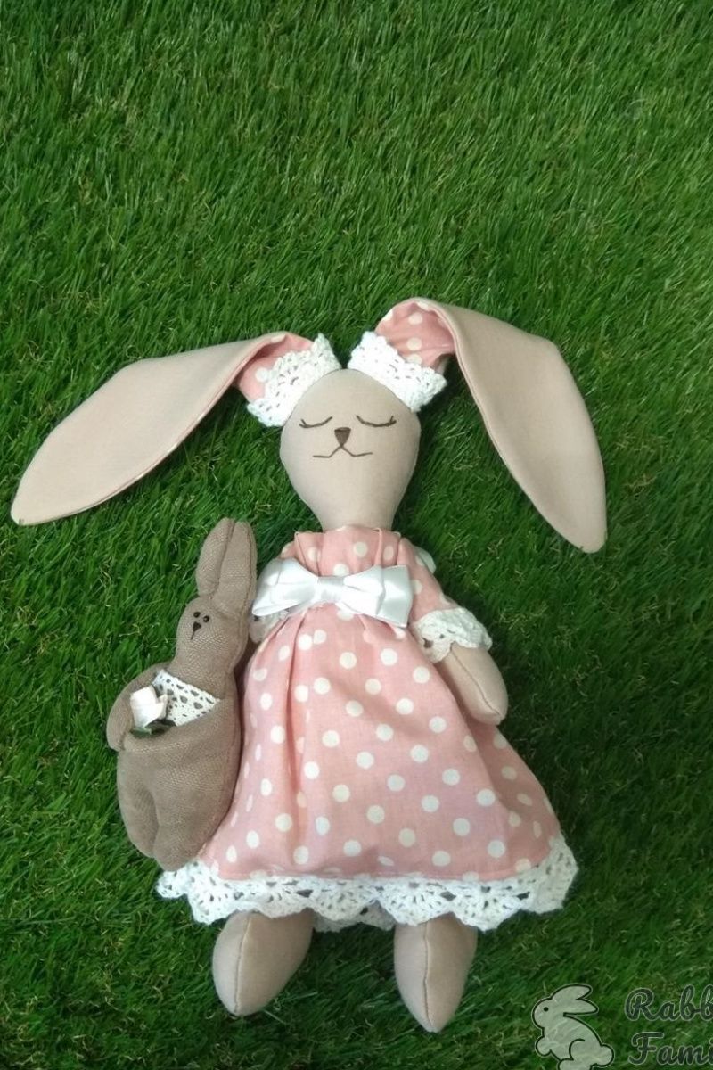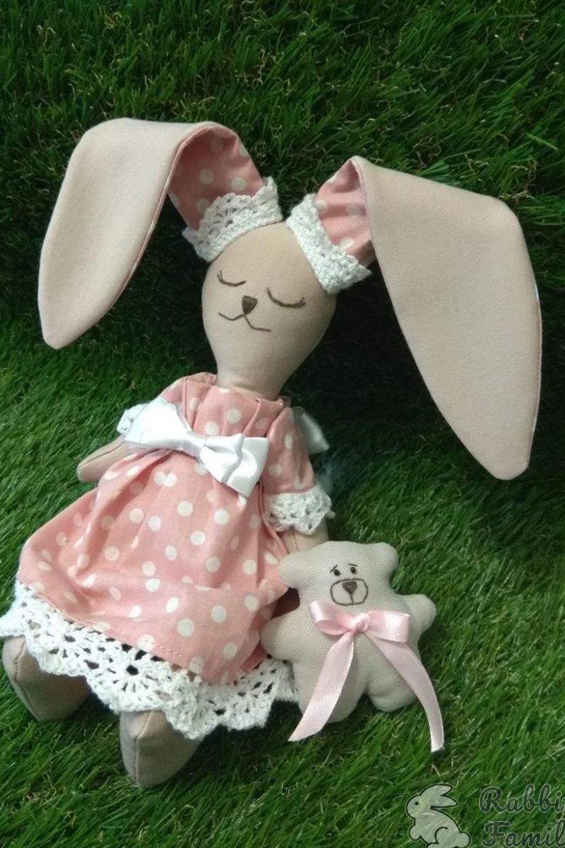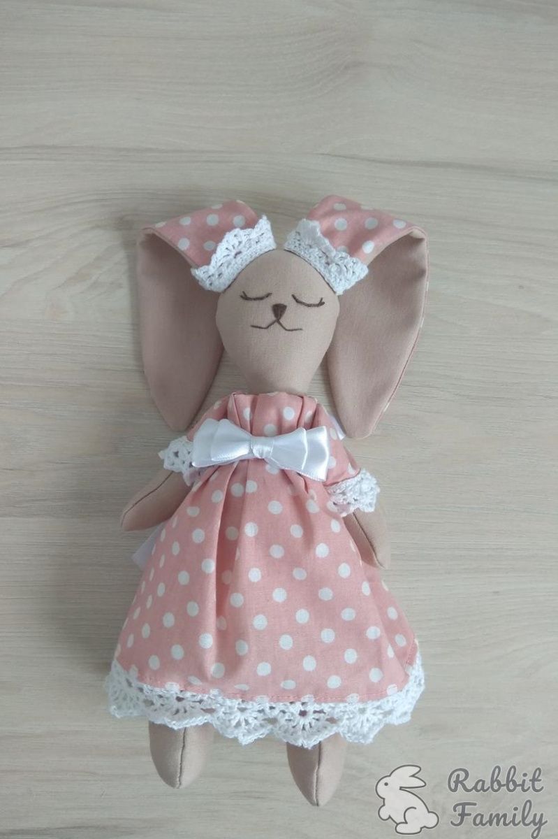 Чарівна зайка шукає собі друга. Виготовлена вручну від п'яток до кінчиків вушок. Гардероб виконаний з натуральної бавовни, мереживо пов'язане вручну. Тіло зайчика - з ніжного, м'якого, приємного на дотик матеріалу. Зайчик - справжня леді і під сукнею у неї спідня білизна у вигляді пантолончиків.