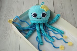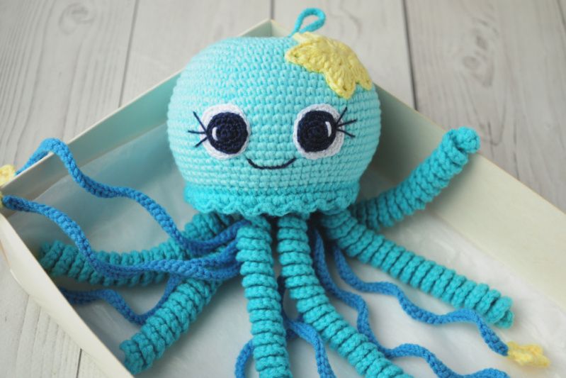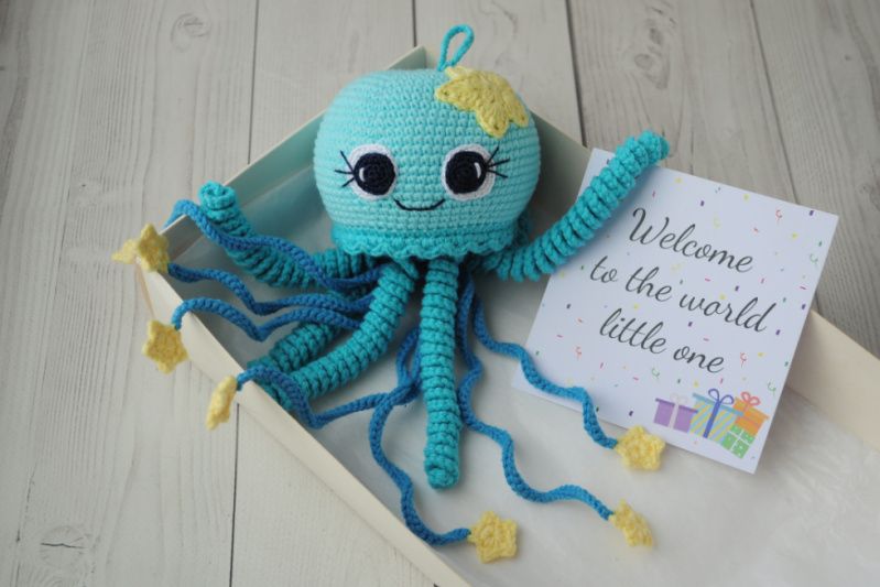 Вы только посмотрите на эту милую Осьминожка! Глядя на нее улыбаться и взрослые, и дети! Связана с любовью, с нежных, приятных на ощупь нитей - 100% хлопок, внутри игрушки гипоаллергенный наполнитель. Особое текстура вязки, ниток, и щупалец в осьминожки помогает новорожденным детям развивать мелкую моторику рук, внутри игрушки есть небольшое погремушка, которая имеет приятный. ненавязчивый звук. С помощью петельки, Осьминожка можно закрепить к манежу, коляски или кроватки. Для удобного ухода выбирайте ручная стирка в мыльной воде, или же стирка на деликатном режиме в стиральной машине. Размер игрушки 22 см. Рекомендуем эту игрушку в качестве подарка для детей в возрасте от 1 месяца и до тех пор, пока продолжается детство :) Если у вас есть пожелания по изменению цвета игрушки - звоните, согласуем все детали. Чтобы приобрести игрушку можно сделать заказ на сайте ZRK, написать нам в Viber или позвонить нам. Делайте особые и радостные подарки для самых дорогих ♥ Осьминожка мечтает уже сегодня начать свое путешествие, спешите приобрести))
