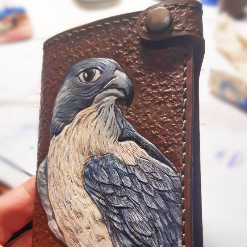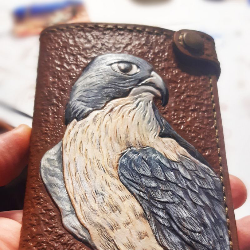 Изображение создано с помощью художественного тиснения и живописного окраса кожи, - краска для кожи Fiebng s Leather Dyu USA;