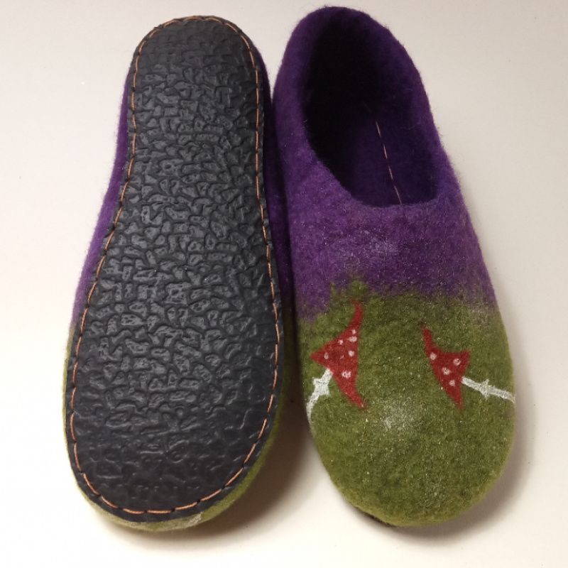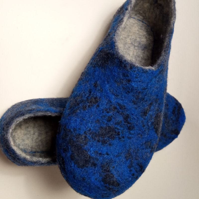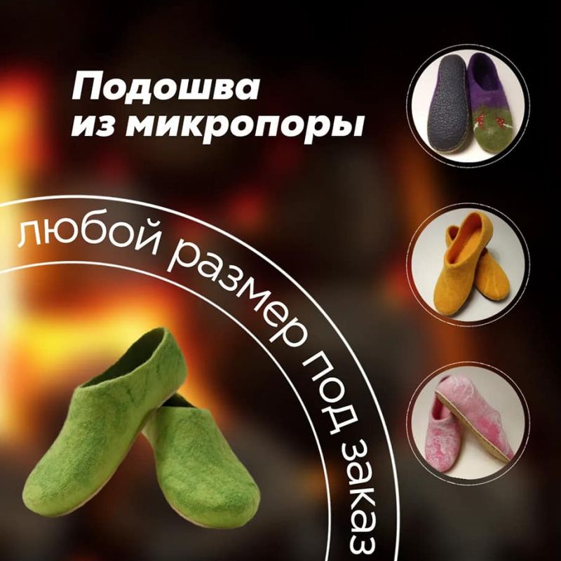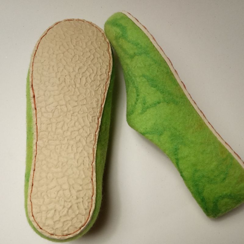 Тапочки выполнены из натуральной шерсти мериноса путем мокрого валяния. Подошва из микропоры проклеена и прошита обувной нитью. Очень крепко уваляны и за счет этого хорошо держат форму. Благодаря естественному ланолину, который находится в натуральной шерсти, тапочки обладают лечебными свойствами и их желательно носить на босу ногу. Подходят на все времена года, ведь в них зимой очень тепло, а летом не жарко.