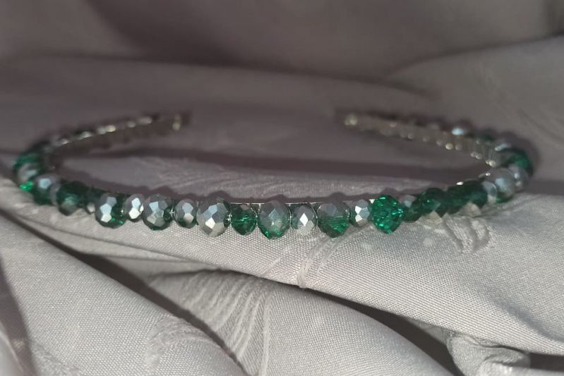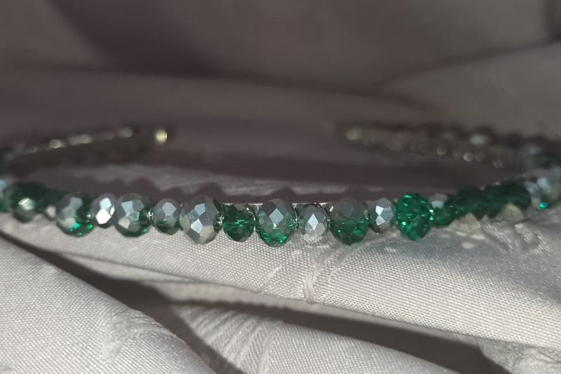 Обруч металлический с хрустальными бусинами "рондель" красивого цвета-зеленого с серебром.