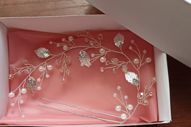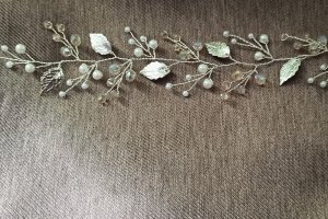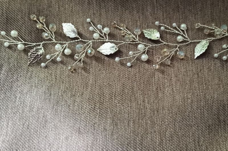 Веточка прекрасно украсит праздничную прическу, созданная из белых и хрустальных цветов "Шампань" бусин, листиков и ювелир.