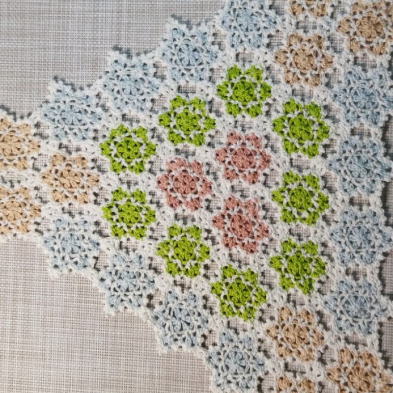 Салфетка из цветных снежинок поможет создать праздничное настроение.
