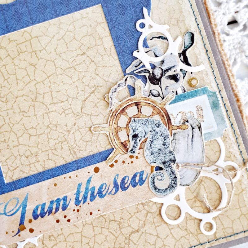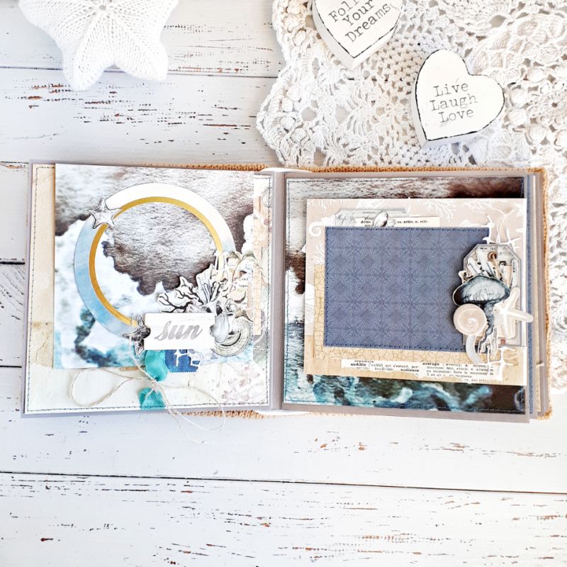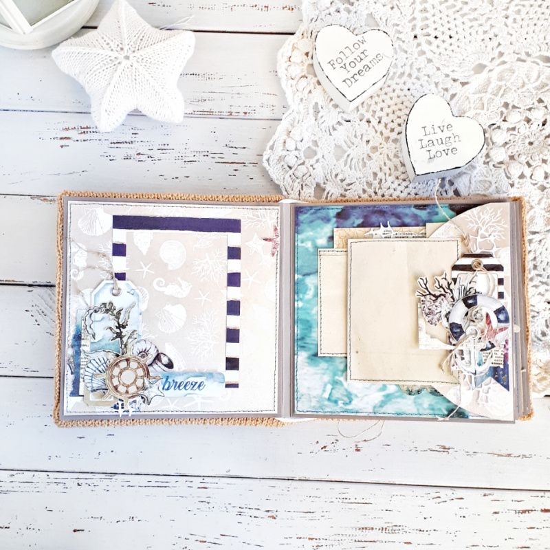 Розмір 17 х 17 см. Має п′ять розворотів (10 сторінок) куди можна вклеїти 21 фотографію різного розміру.