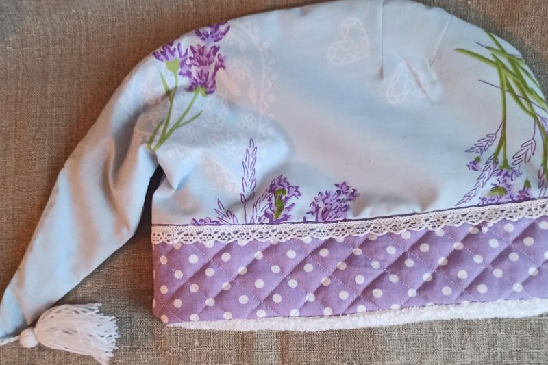 Ночной колпак Ажурная Лаванда уютный и теплый, он согреет и сделает сон сладким, а подарок незабываемый. Колпак будет прекрасным подарком дорогим людям, которые поймут насколько вы любите и заботитесь о них. Колпак выполнен из натурального хлопка, низ простеган с синтепоном, нижняя подкладка состоит из нежной хлопковой махры и мягкой фланели. Колпак можно дополнить также маской для сна. К набору идёт маленький подарок от меня, лавандовое саше. Кроме того по индивидуальному заказу могу дополнить колпак ручной вышивкой инициалами, именем или фразой сладких снов. В сезон праздников прошу делать заказы заранее, чтобы они успели вовремя дойти. Всем хорошего настроения! Сладких, безмятежных снов.