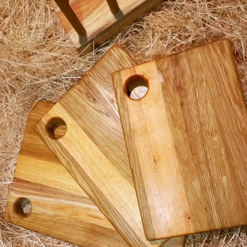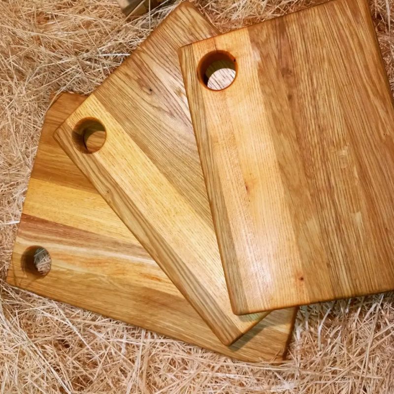 Изделия сделаны из дуба с добавлением гледичия, пропитанны масло воском. В набор входит три доски размером 35 ×25, 31.5×22, 28×19см. Толщина 2.5см. И подставка под них.