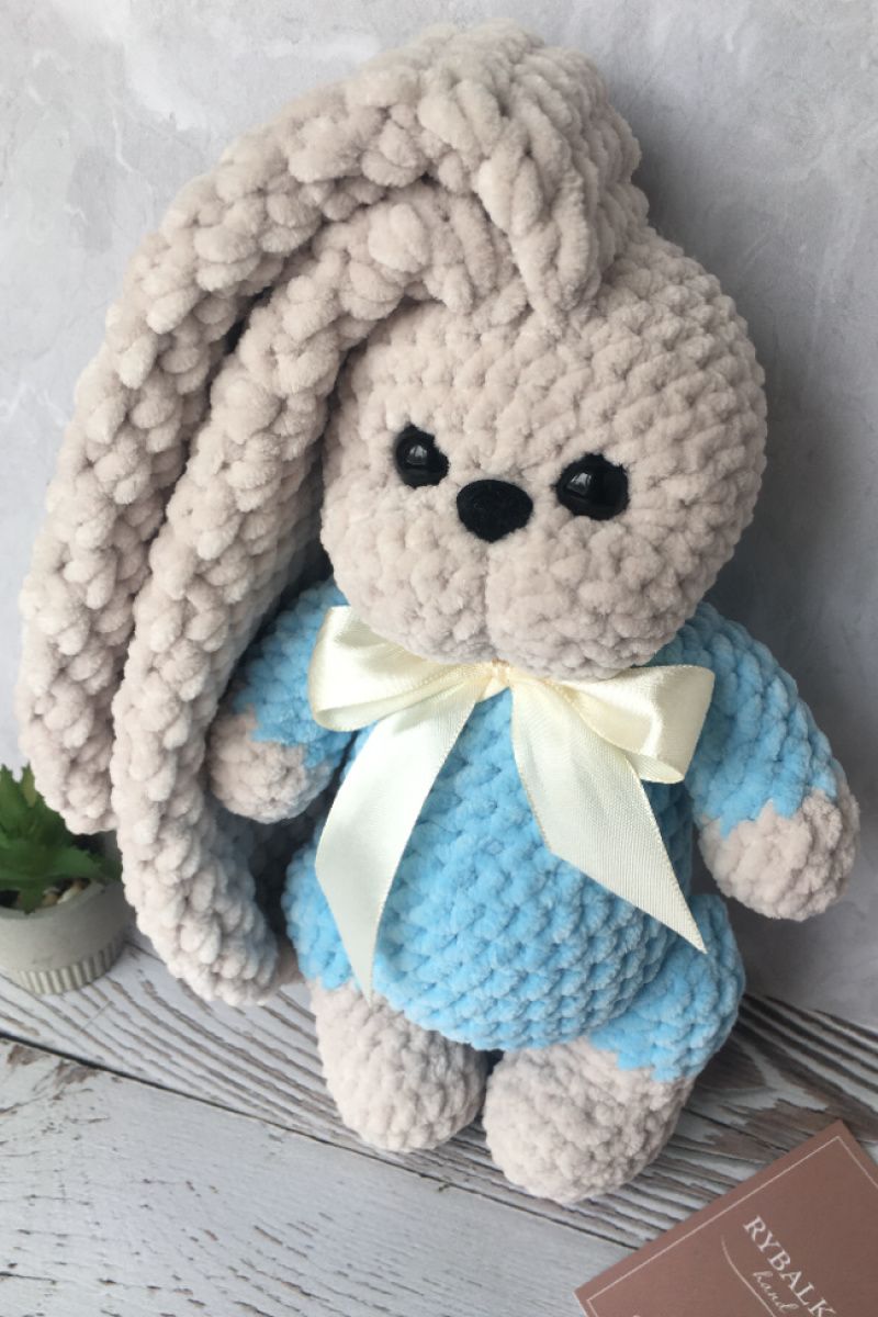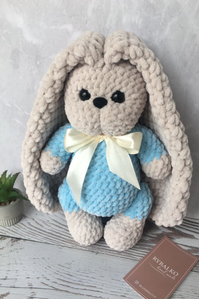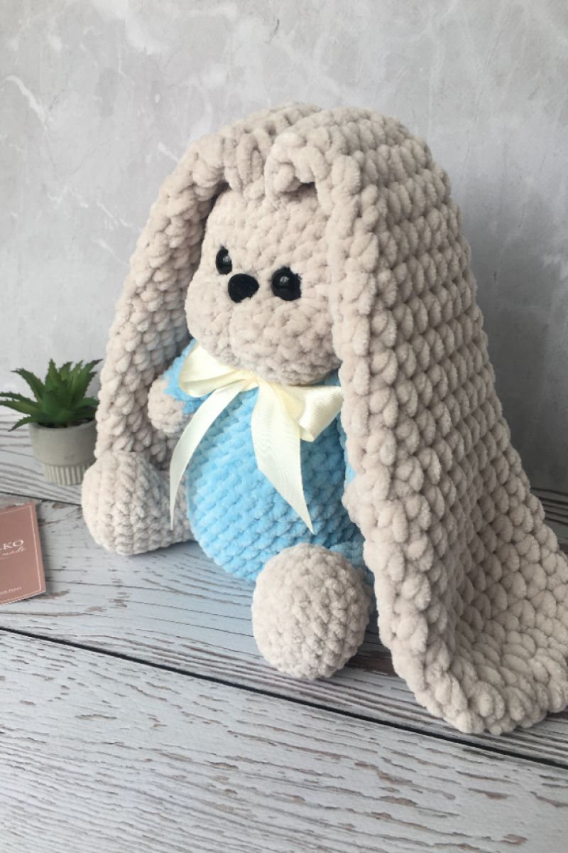 Вязаный зайчик из плюшевой пряжи. Очень приятный на ощупь. Побывав в руках, никого не оставит равнодушным. Ножки на шплинтовом креплении (крутятся и зайчик может сидеть). Глазки на безопасном креплении, носик на клею.