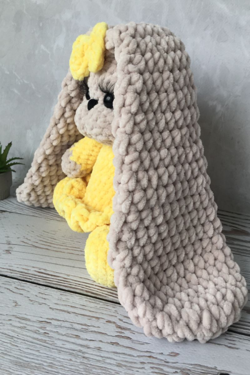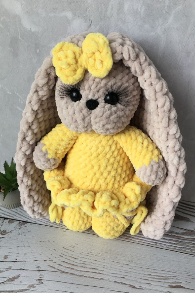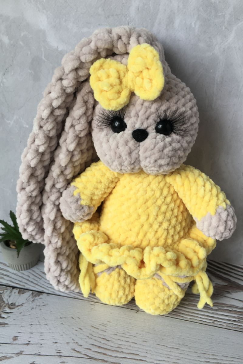 Вязаная зайка из плюшевой пряжи. Очень приятная на ощупь. Побывав в руках, никого не оставит равнодушным. Ножки на шплинтовом креплении (крутятся и зайчик может сидеть). Глазки на безопасном креплении, носик и реснички на клею.