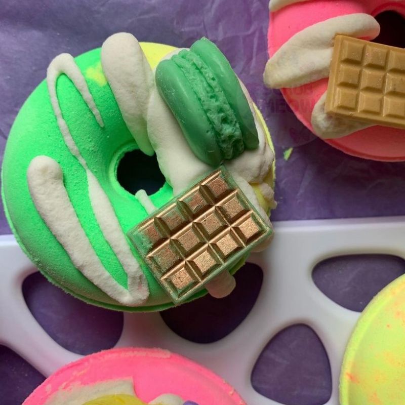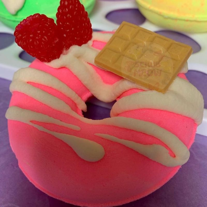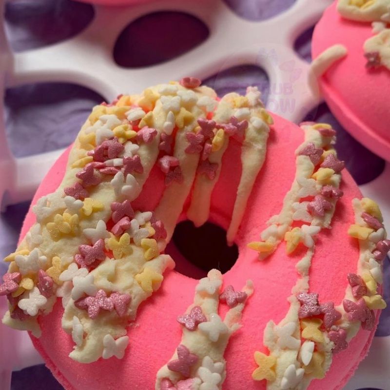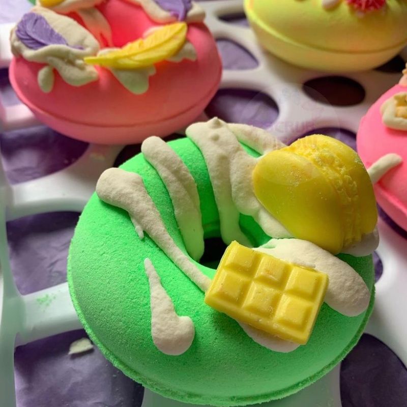 Пончик - это шипучая бомбочка которая поливается белым кремом (пралине для ванны, которое увлажняет тело) и украшается мини мылком!