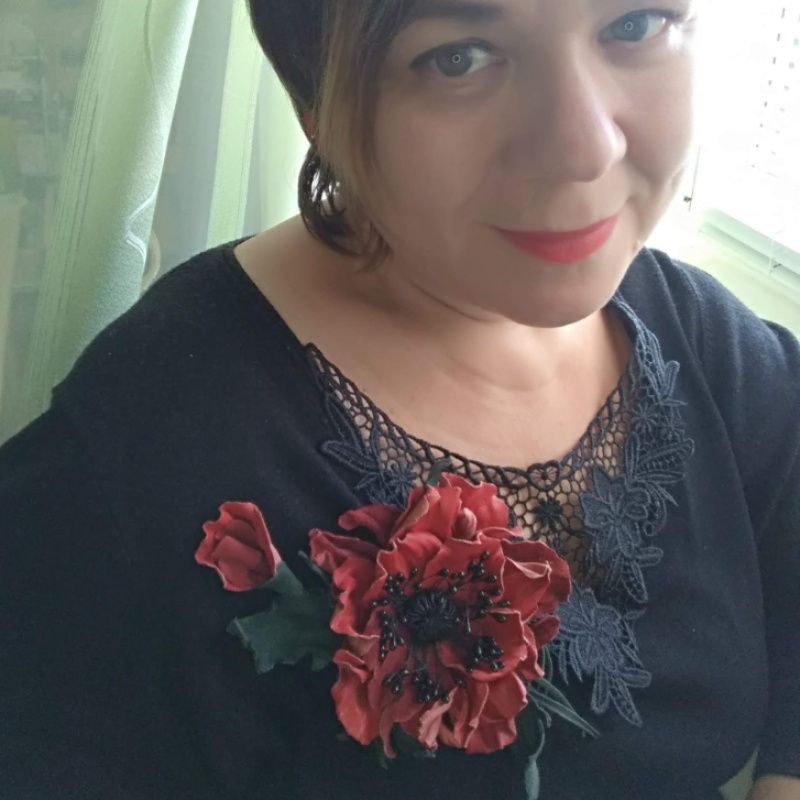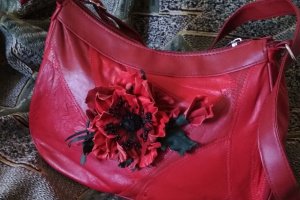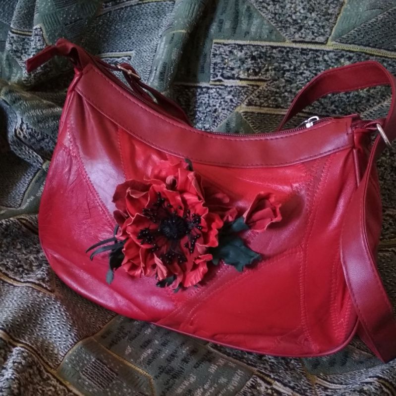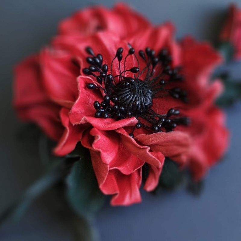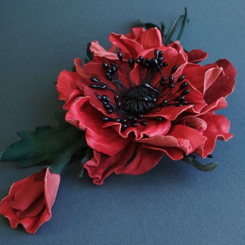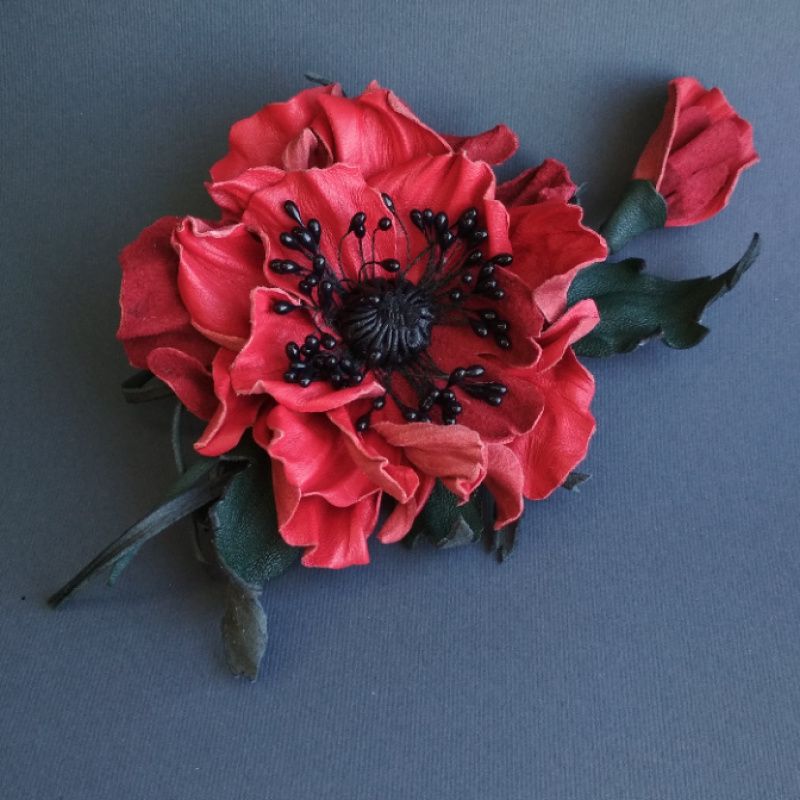 Брошь мак изготовлена полностью из кожи,каждый лепесток.Выглядит очень реалистично. Любая одежда,даже просто футболка станет с такой брошкой нарядной! Диаметр цветка 10см