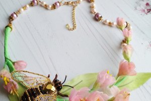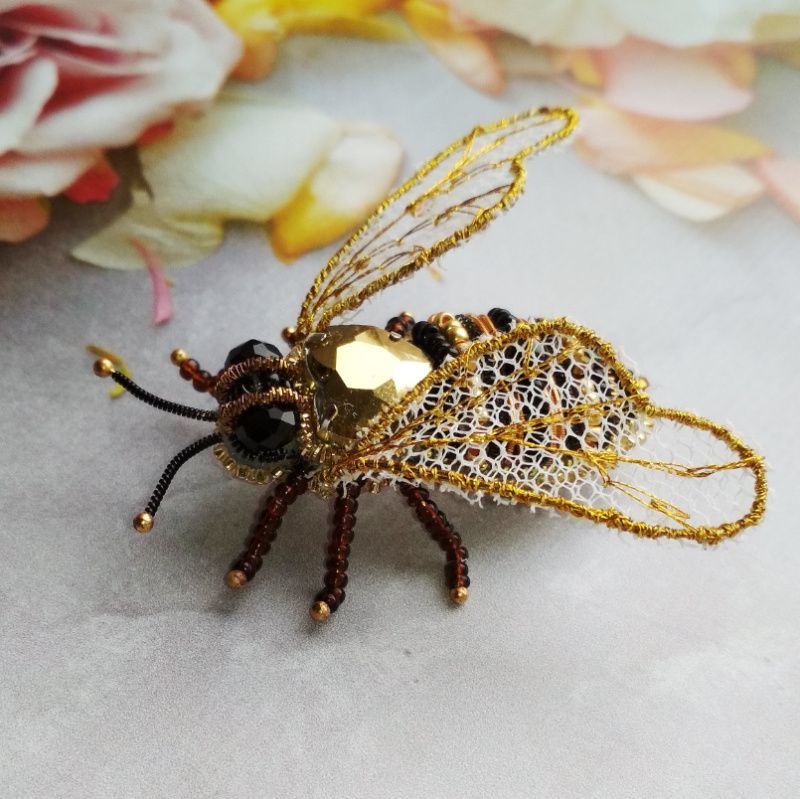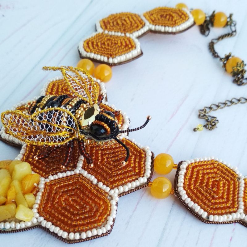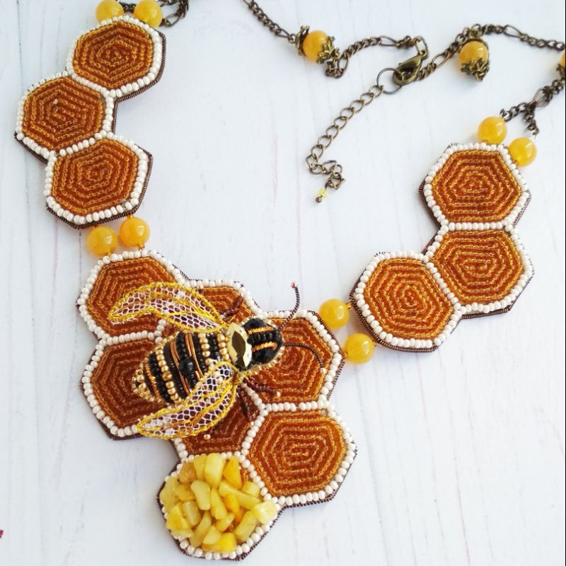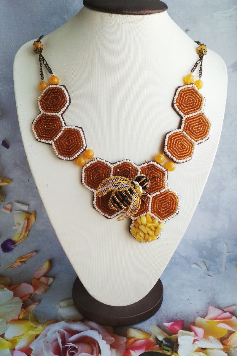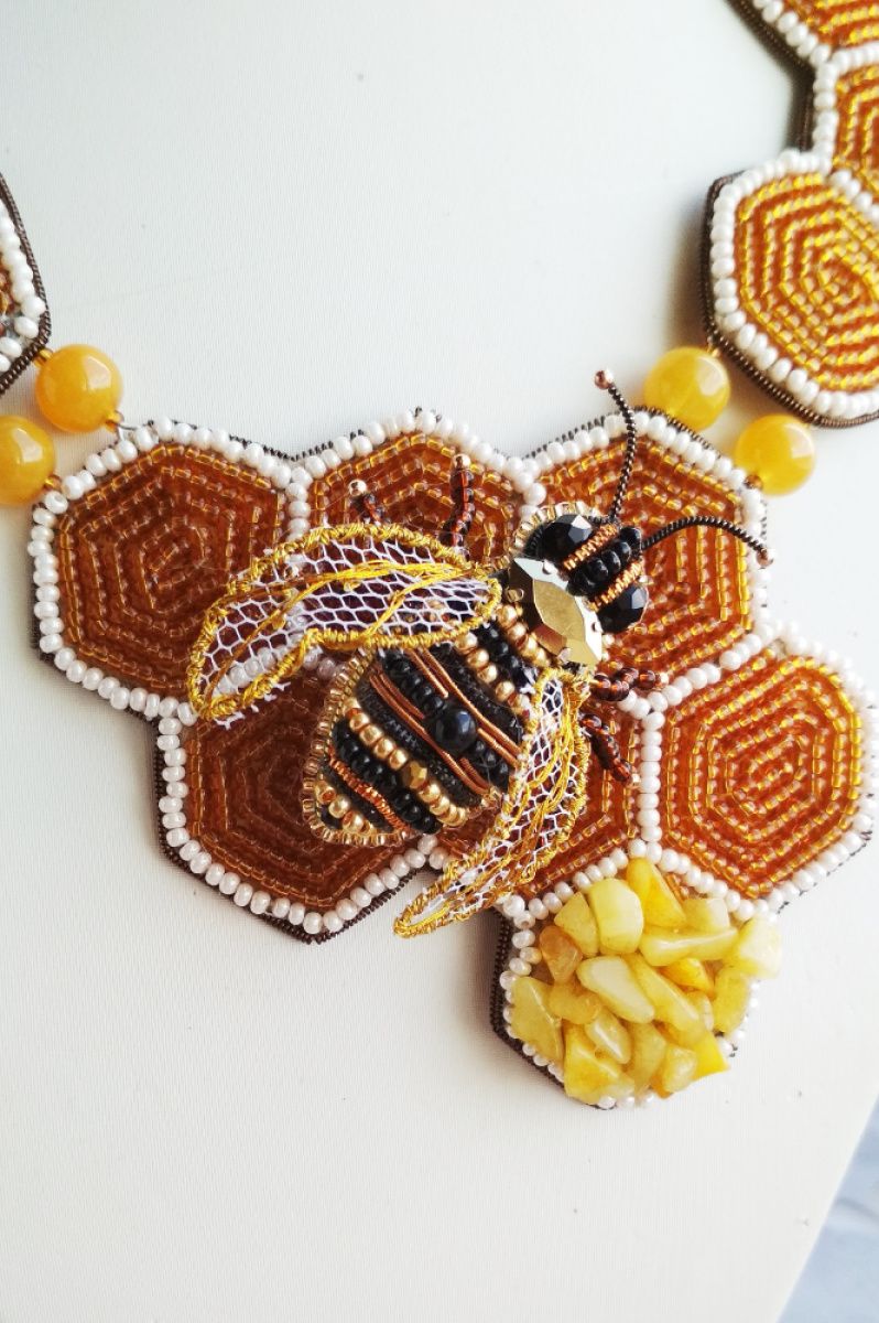 Оригінальне кольє Мед та бджілка повністю ручна робота. Задник Кольє -шкіра.У роботі використані якісні матеріали: чеський бісер,кристали Сваровські,трунцал, натуральний камінь цитрин.Оригінальність кольє Мед та бджілка в тому,що Бджілка відстібається і можна носити окремо як брошка.